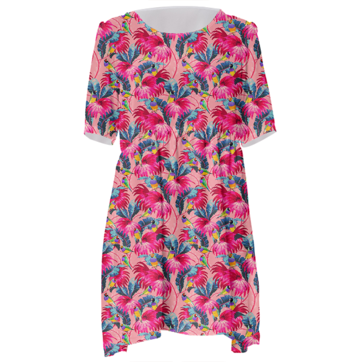 Loose swing fit babydoll dress with shirred waist short sleeves and scoop neckline. The uploaded file will be printed on the entire front and be mirrored on the back. The uploaded file will be printed on the entire front and be mirrored on the back. Because of our cut and sew process some print elements on pockets seams and sleeves might not match up. For best results please upload a PNG or JPG with RGB color profile and dimensions of at least 35 inches width by 40 inches length. DPI can be as low as 72. Since every piece is custom made, it may take 2-4 weeks for delivery. Made in our studio (Shanghai).