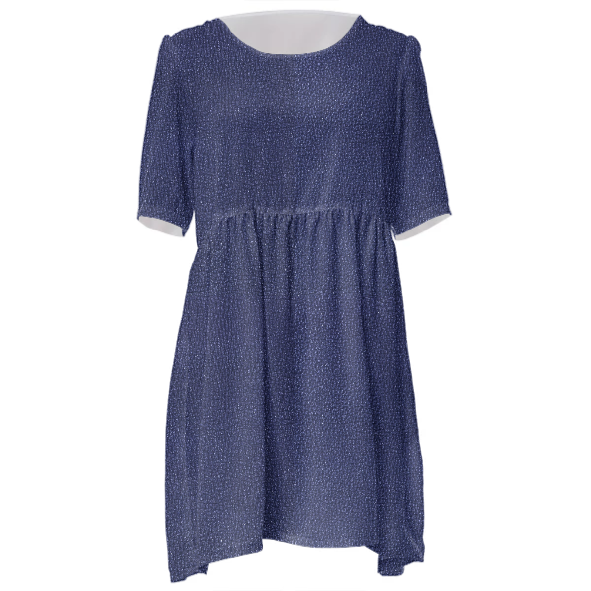 Loose swing fit babydoll dress with shirred waist short sleeves and scoop neckline. The uploaded file will be printed on the entire front and be mirrored on the back. The uploaded file will be printed on the entire front and be mirrored on the back. Because of our cut and sew process some print elements on pockets seams and sleeves might not match up. For best results please upload a PNG or JPG with RGB color profile and dimensions of at least 35 inches width by 40 inches length. DPI can be as low as 72. Since every piece is custom made, it may take 2-4 weeks for delivery. Made in our studio (Shanghai).