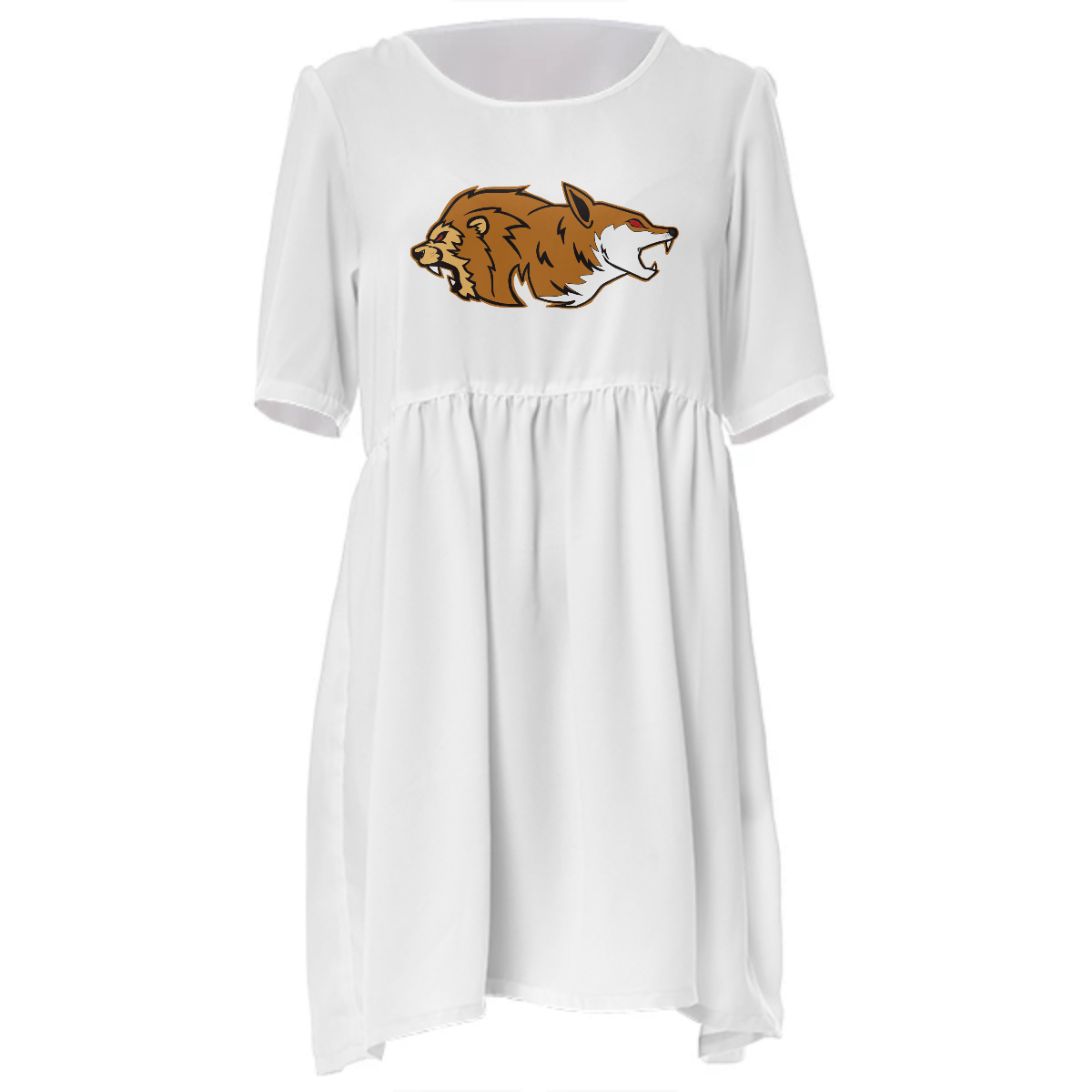 Loose swing fit babydoll dress with shirred waist short sleeves and scoop neckline. The uploaded file will be printed on the entire front and be mirrored on the back. The uploaded file will be printed on the entire front and be mirrored on the back. Because of our cut and sew process some print elements on pockets seams and sleeves might not match up. For best results please upload a PNG or JPG with RGB color profile and dimensions of at least 35 inches width by 40 inches length. DPI can be as low as 72. Since every piece is custom made, it may take 2-4 weeks for delivery. Made in our studio (Shanghai).