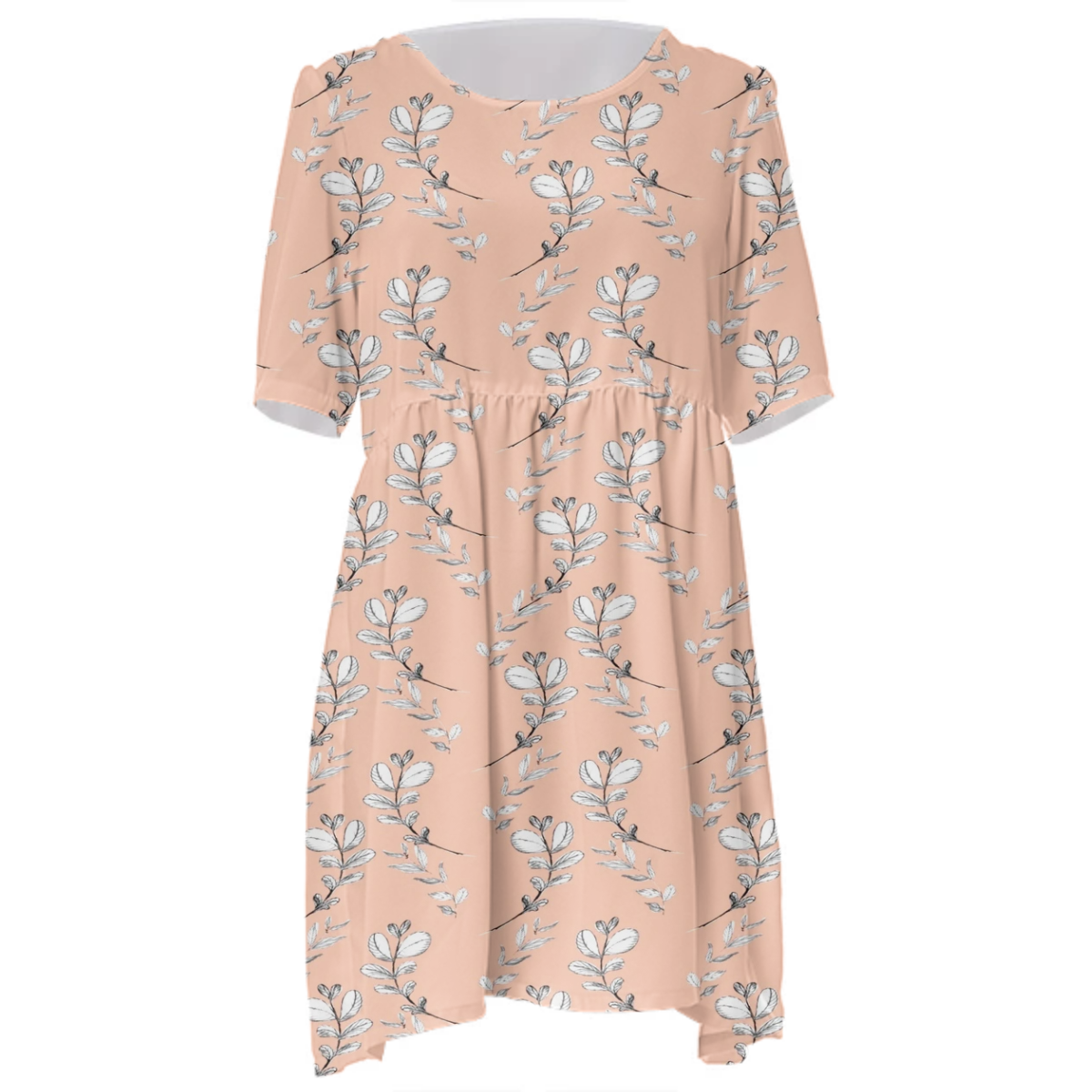 Loose swing fit babydoll dress with shirred waist short sleeves and scoop neckline. The uploaded file will be printed on the entire front and be mirrored on the back. The uploaded file will be printed on the entire front and be mirrored on the back. Because of our cut and sew process some print elements on pockets seams and sleeves might not match up. For best results please upload a PNG or JPG with RGB color profile and dimensions of at least 35 inches width by 40 inches length. DPI can be as low as 72. Since every piece is custom made, it may take 2-4 weeks for delivery. Made in our studio (Shanghai).