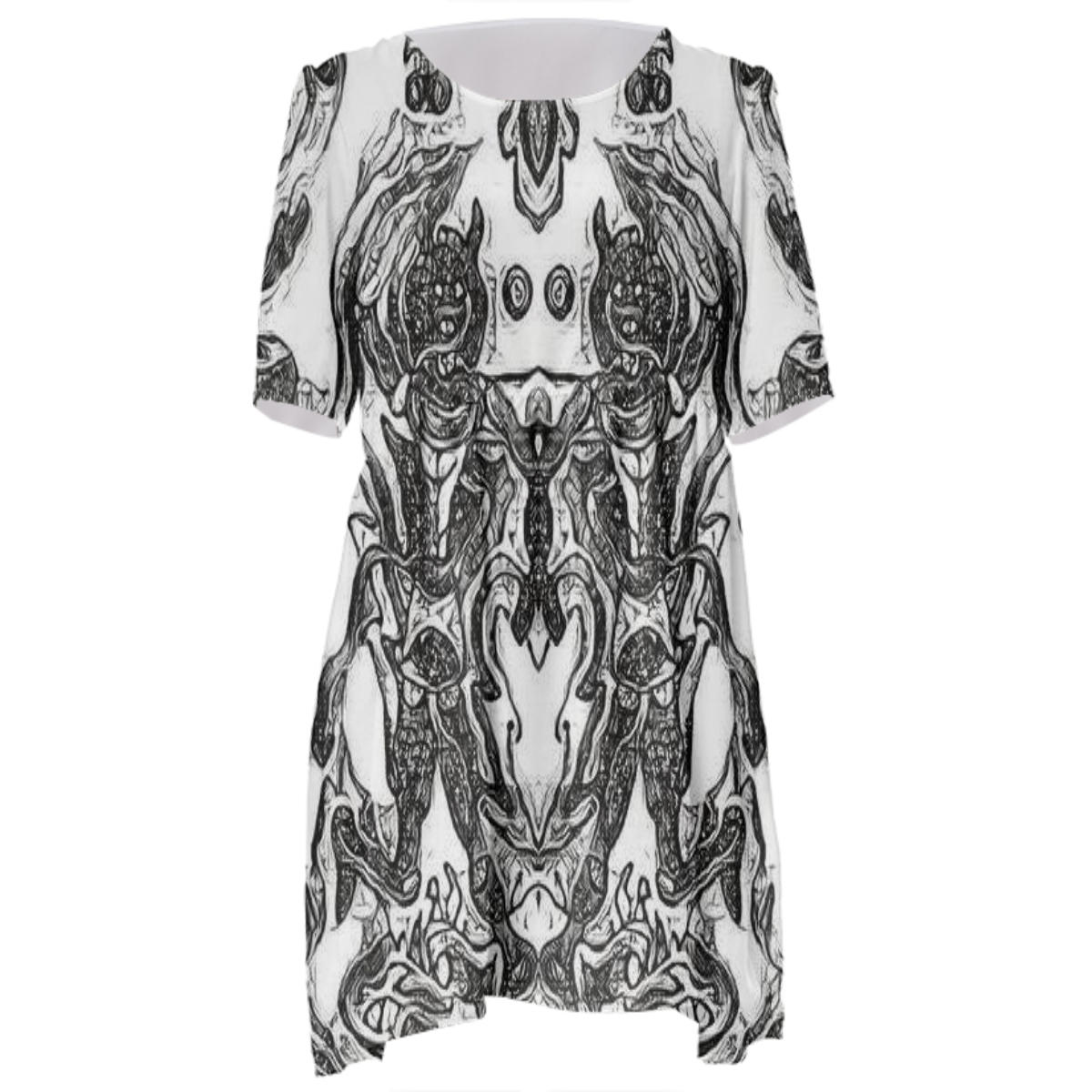 Loose swing fit babydoll dress with shirred waist short sleeves and scoop neckline. The uploaded file will be printed on the entire front and be mirrored on the back. The uploaded file will be printed on the entire front and be mirrored on the back. Because of our cut and sew process some print elements on pockets seams and sleeves might not match up. For best results please upload a PNG or JPG with RGB color profile and dimensions of at least 35 inches width by 40 inches length. DPI can be as low as 72. Since every piece is custom made, it may take 2-4 weeks for delivery. Made in our studio (Shanghai).