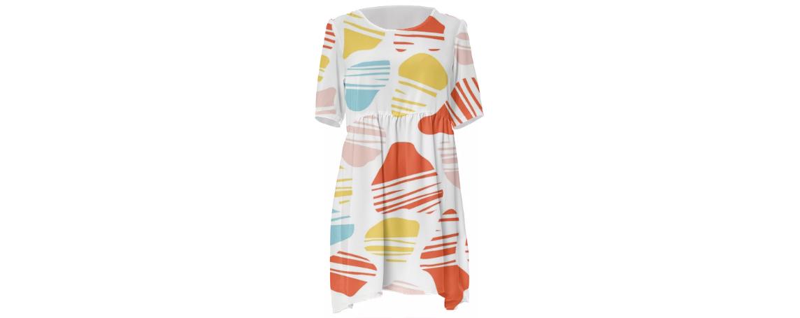 Loose swing fit babydoll dress with shirred waist short sleeves and scoop neckline. The uploaded file will be printed on the entire front and be mirrored on the back. The uploaded file will be printed on the entire front and be mirrored on the back. Because of our cut and sew process some print elements on pockets seams and sleeves might not match up. For best results please upload a PNG or JPG with RGB color profile and dimensions of at least 35 inches width by 40 inches length. DPI can be as low as 72. Since every piece is custom made, it may take 2-4 weeks for delivery. Made in our studio (Shanghai).