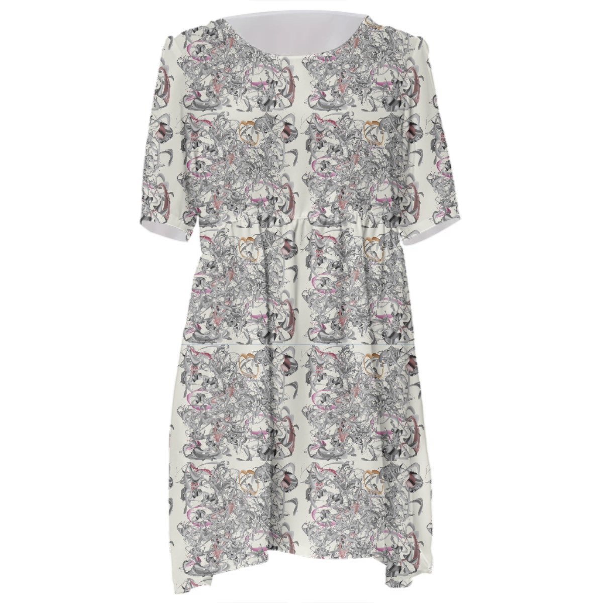 Loose swing fit babydoll dress with shirred waist short sleeves and scoop neckline. The uploaded file will be printed on the entire front and be mirrored on the back. The uploaded file will be printed on the entire front and be mirrored on the back. Because of our cut and sew process some print elements on pockets seams and sleeves might not match up. For best results please upload a PNG or JPG with RGB color profile and dimensions of at least 35 inches width by 40 inches length. DPI can be as low as 72. Since every piece is custom made, it may take 2-4 weeks for delivery. Made in our studio (Shanghai).