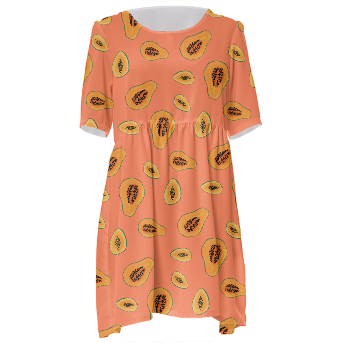 Loose swing fit babydoll dress with shirred waist short sleeves and scoop neckline. The uploaded file will be printed on the entire front and be mirrored on the back. The uploaded file will be printed on the entire front and be mirrored on the back. Because of our cut and sew process some print elements on pockets seams and sleeves might not match up. For best results please upload a PNG or JPG with RGB color profile and dimensions of at least 35 inches width by 40 inches length. DPI can be as low as 72. Since every piece is custom made, it may take 2-4 weeks for delivery. Made in our studio (Shanghai).
