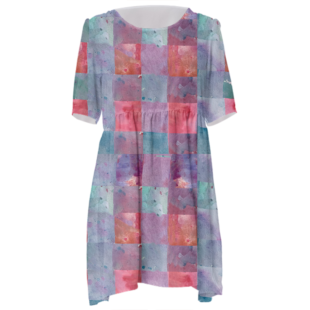 Loose swing fit babydoll dress with shirred waist short sleeves and scoop neckline. The uploaded file will be printed on the entire front and be mirrored on the back. The uploaded file will be printed on the entire front and be mirrored on the back. Because of our cut and sew process some print elements on pockets seams and sleeves might not match up. For best results please upload a PNG or JPG with RGB color profile and dimensions of at least 35 inches width by 40 inches length. DPI can be as low as 72. Since every piece is custom made, it may take 2-4 weeks for delivery. Made in our studio (Shanghai).