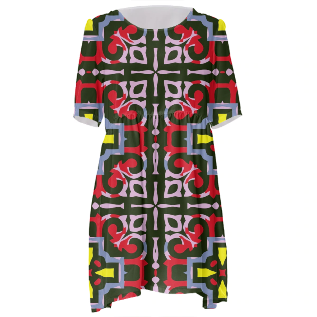 Loose swing fit babydoll dress with shirred waist short sleeves and scoop neckline. The uploaded file will be printed on the entire front and be mirrored on the back. The uploaded file will be printed on the entire front and be mirrored on the back. Because of our cut and sew process some print elements on pockets seams and sleeves might not match up. For best results please upload a PNG or JPG with RGB color profile and dimensions of at least 35 inches width by 40 inches length. DPI can be as low as 72. Since every piece is custom made, it may take 2-4 weeks for delivery. Made in our studio (Shanghai).