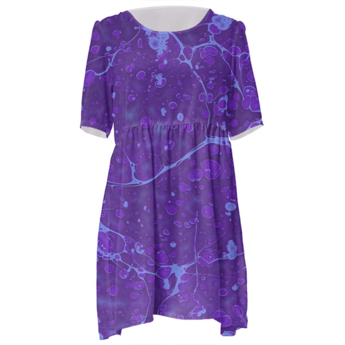 Loose swing fit babydoll dress with shirred waist short sleeves and scoop neckline. The uploaded file will be printed on the entire front and be mirrored on the back. The uploaded file will be printed on the entire front and be mirrored on the back. Because of our cut and sew process some print elements on pockets seams and sleeves might not match up. For best results please upload a PNG or JPG with RGB color profile and dimensions of at least 35 inches width by 40 inches length. DPI can be as low as 72. Since every piece is custom made, it may take 2-4 weeks for delivery. Made in our studio (Shanghai).