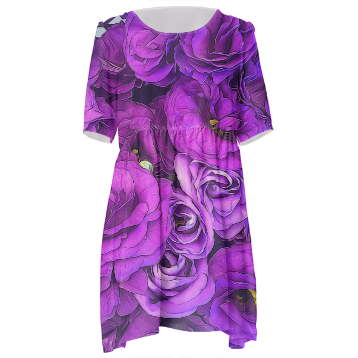 Loose swing fit babydoll dress with shirred waist short sleeves and scoop neckline. The uploaded file will be printed on the entire front and be mirrored on the back. The uploaded file will be printed on the entire front and be mirrored on the back. Because of our cut and sew process some print elements on pockets seams and sleeves might not match up. For best results please upload a PNG or JPG with RGB color profile and dimensions of at least 35 inches width by 40 inches length. DPI can be as low as 72. Since every piece is custom made, it may take 2-4 weeks for delivery. Made in our studio (Shanghai).