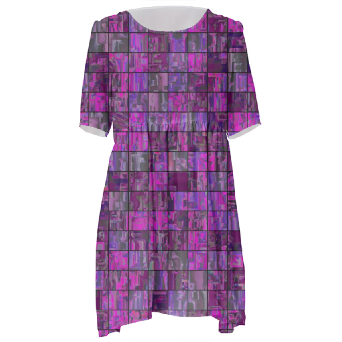 Loose swing fit babydoll dress with shirred waist short sleeves and scoop neckline. The uploaded file will be printed on the entire front and be mirrored on the back. The uploaded file will be printed on the entire front and be mirrored on the back. Because of our cut and sew process some print elements on pockets seams and sleeves might not match up. For best results please upload a PNG or JPG with RGB color profile and dimensions of at least 35 inches width by 40 inches length. DPI can be as low as 72. Since every piece is custom made, it may take 2-4 weeks for delivery. Made in our studio (Shanghai).