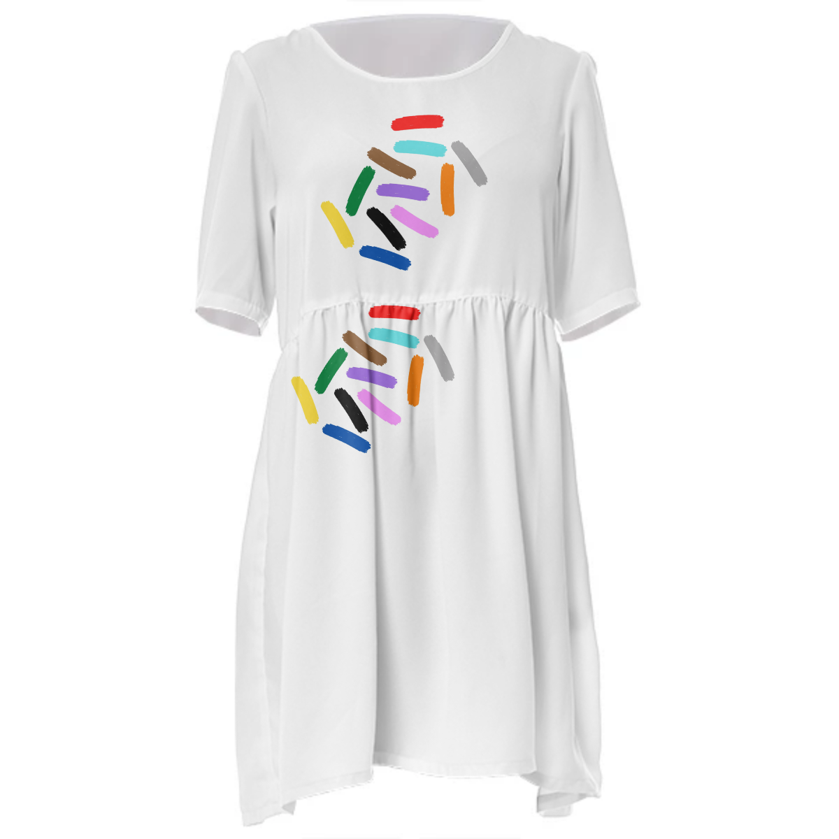 Loose swing fit babydoll dress with shirred waist short sleeves and scoop neckline. The uploaded file will be printed on the entire front and be mirrored on the back. The uploaded file will be printed on the entire front and be mirrored on the back. Because of our cut and sew process some print elements on pockets seams and sleeves might not match up. For best results please upload a PNG or JPG with RGB color profile and dimensions of at least 35 inches width by 40 inches length. DPI can be as low as 72. Since every piece is custom made, it may take 2-4 weeks for delivery. Made in our studio (Shanghai).