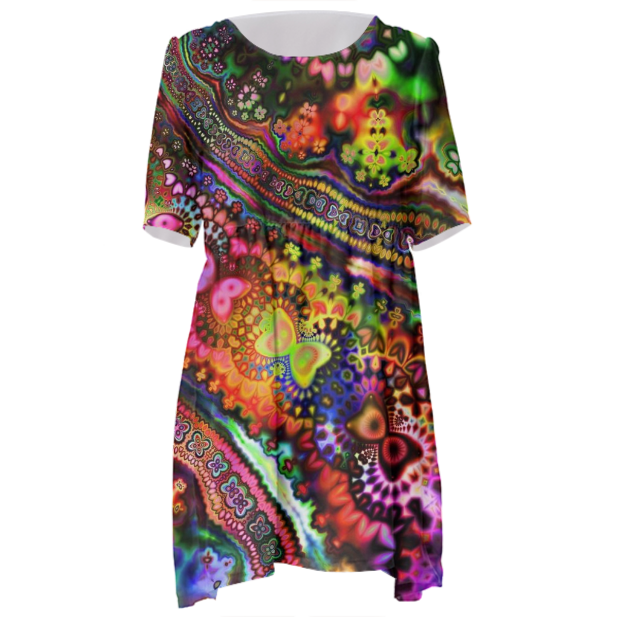 Loose swing fit babydoll dress with shirred waist short sleeves and scoop neckline. The uploaded file will be printed on the entire front and be mirrored on the back. The uploaded file will be printed on the entire front and be mirrored on the back. Because of our cut and sew process some print elements on pockets seams and sleeves might not match up. For best results please upload a PNG or JPG with RGB color profile and dimensions of at least 35 inches width by 40 inches length. DPI can be as low as 72. Since every piece is custom made, it may take 2-4 weeks for delivery. Made in our studio (Shanghai).