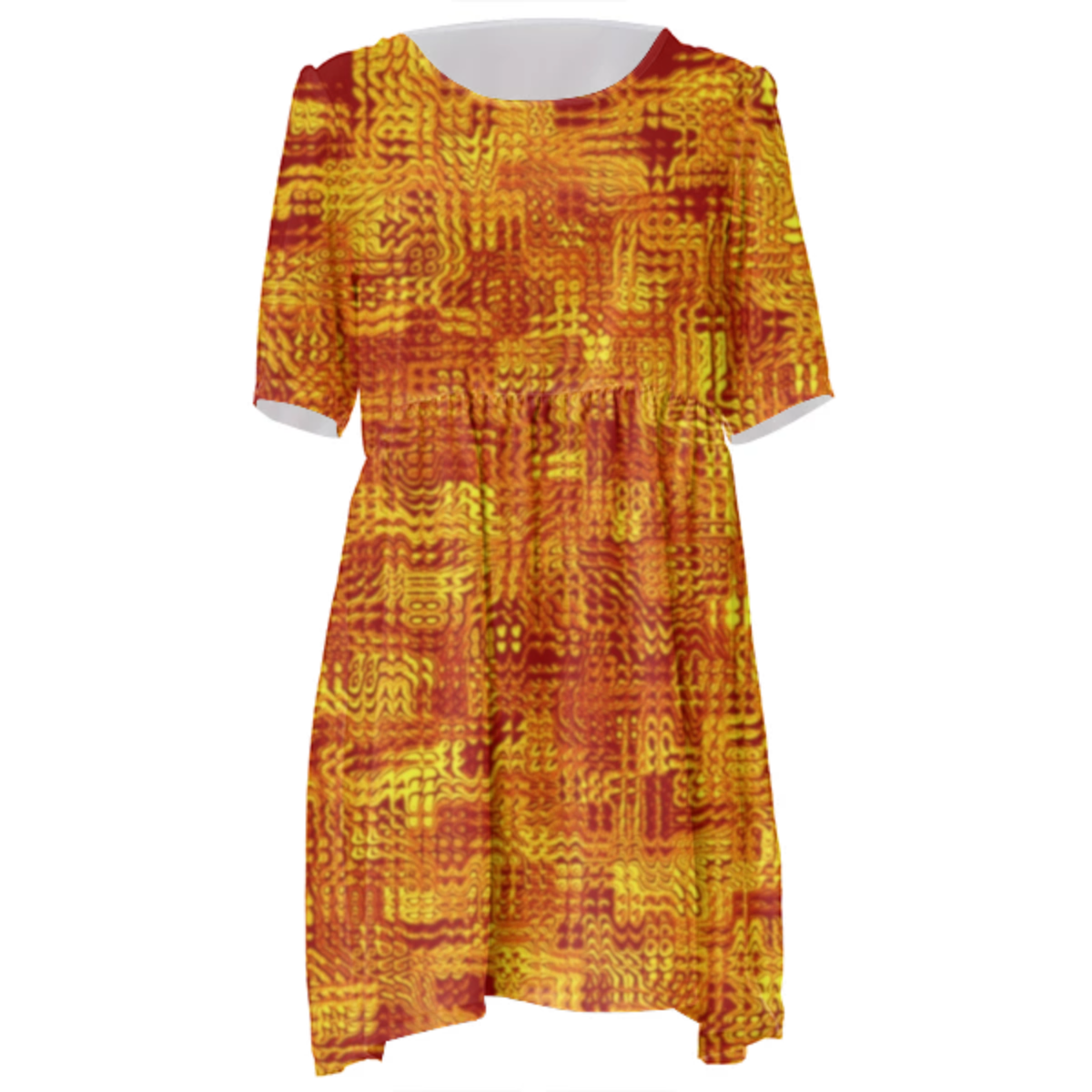 Loose swing fit babydoll dress with shirred waist short sleeves and scoop neckline. The uploaded file will be printed on the entire front and be mirrored on the back. The uploaded file will be printed on the entire front and be mirrored on the back. Because of our cut and sew process some print elements on pockets seams and sleeves might not match up. For best results please upload a PNG or JPG with RGB color profile and dimensions of at least 35 inches width by 40 inches length. DPI can be as low as 72. Since every piece is custom made, it may take 2-4 weeks for delivery. Made in our studio (Shanghai).