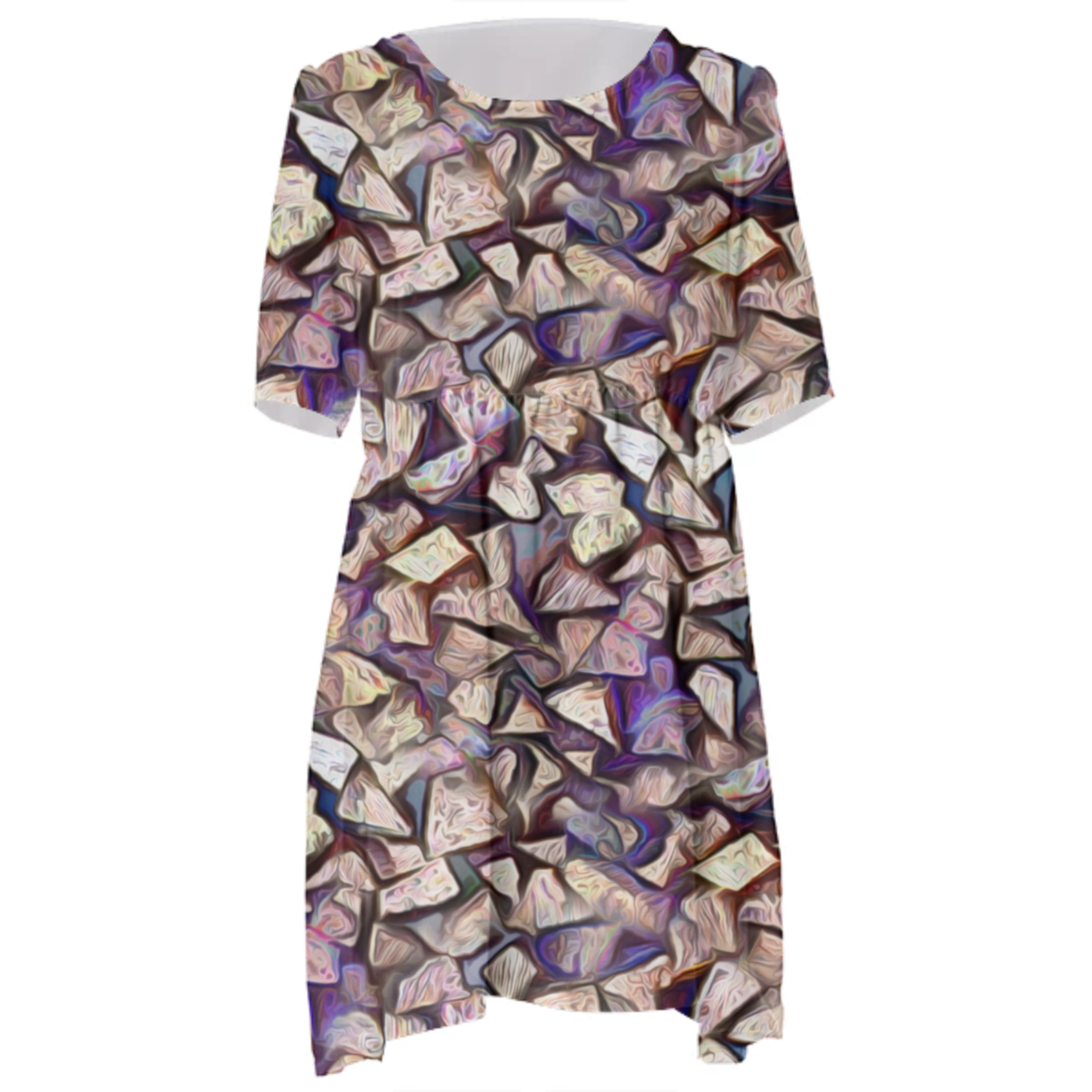 Loose swing fit babydoll dress with shirred waist short sleeves and scoop neckline. The uploaded file will be printed on the entire front and be mirrored on the back. The uploaded file will be printed on the entire front and be mirrored on the back. Because of our cut and sew process some print elements on pockets seams and sleeves might not match up. For best results please upload a PNG or JPG with RGB color profile and dimensions of at least 35 inches width by 40 inches length. DPI can be as low as 72. Since every piece is custom made, it may take 2-4 weeks for delivery. Made in our studio (Shanghai).