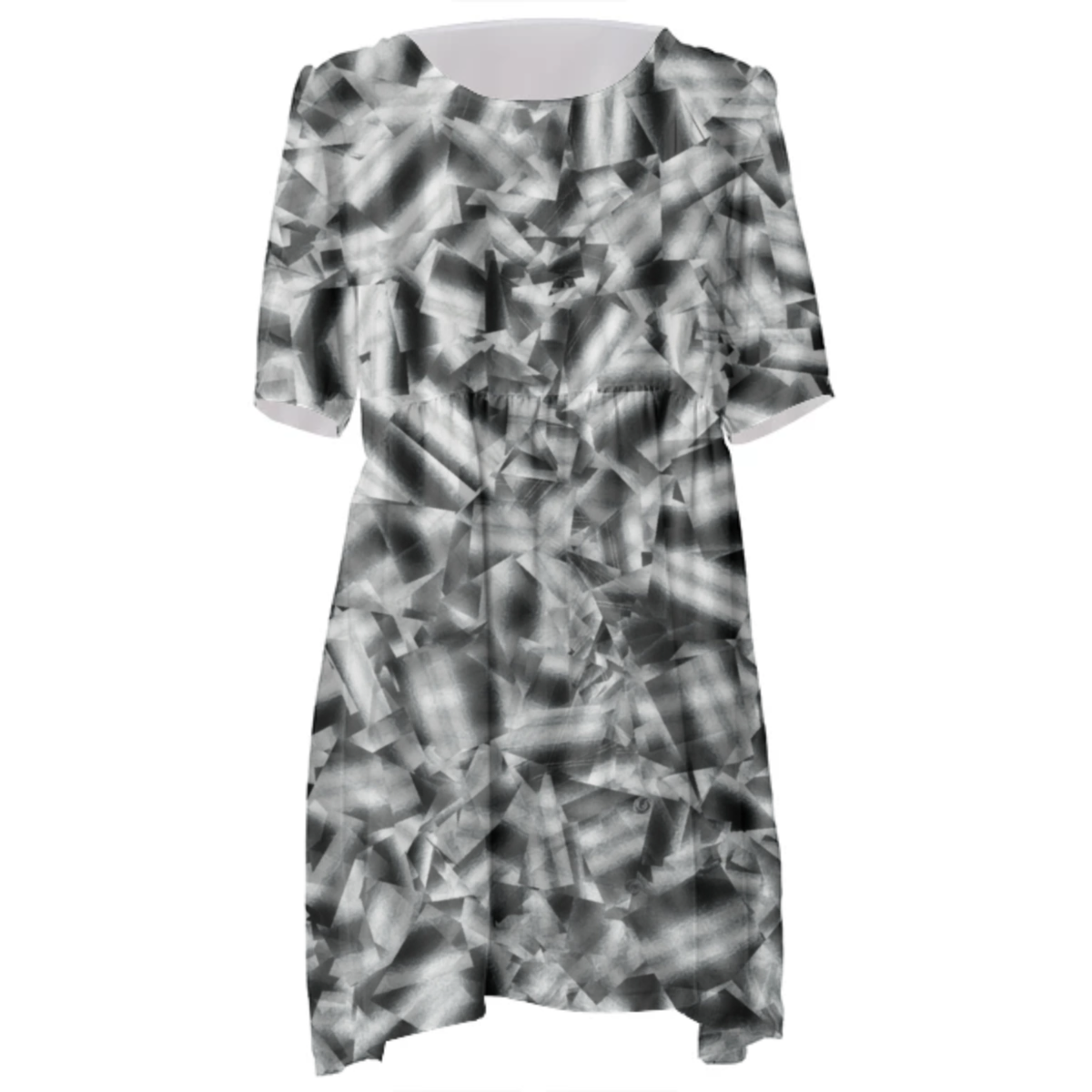 Loose swing fit babydoll dress with shirred waist short sleeves and scoop neckline. The uploaded file will be printed on the entire front and be mirrored on the back. The uploaded file will be printed on the entire front and be mirrored on the back. Because of our cut and sew process some print elements on pockets seams and sleeves might not match up. For best results please upload a PNG or JPG with RGB color profile and dimensions of at least 35 inches width by 40 inches length. DPI can be as low as 72. Since every piece is custom made, it may take 2-4 weeks for delivery. Made in our studio (Shanghai).