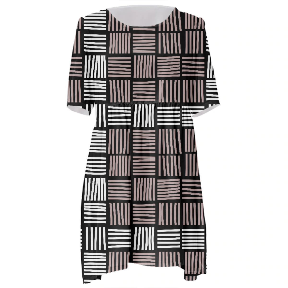 Loose swing fit babydoll dress with shirred waist short sleeves and scoop neckline. The uploaded file will be printed on the entire front and be mirrored on the back. The uploaded file will be printed on the entire front and be mirrored on the back. Because of our cut and sew process some print elements on pockets seams and sleeves might not match up. For best results please upload a PNG or JPG with RGB color profile and dimensions of at least 35 inches width by 40 inches length. DPI can be as low as 72. Since every piece is custom made, it may take 2-4 weeks for delivery. Made in our studio (Shanghai).
