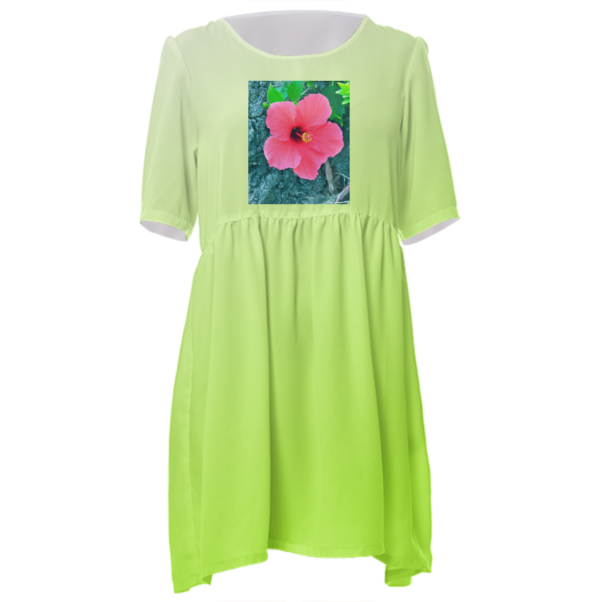 Loose swing fit babydoll dress with shirred waist short sleeves and scoop neckline. The uploaded file will be printed on the entire front and be mirrored on the back. The uploaded file will be printed on the entire front and be mirrored on the back. Because of our cut and sew process some print elements on pockets seams and sleeves might not match up. For best results please upload a PNG or JPG with RGB color profile and dimensions of at least 35 inches width by 40 inches length. DPI can be as low as 72. Since every piece is custom made, it may take 2-4 weeks for delivery. Made in our studio (Shanghai).