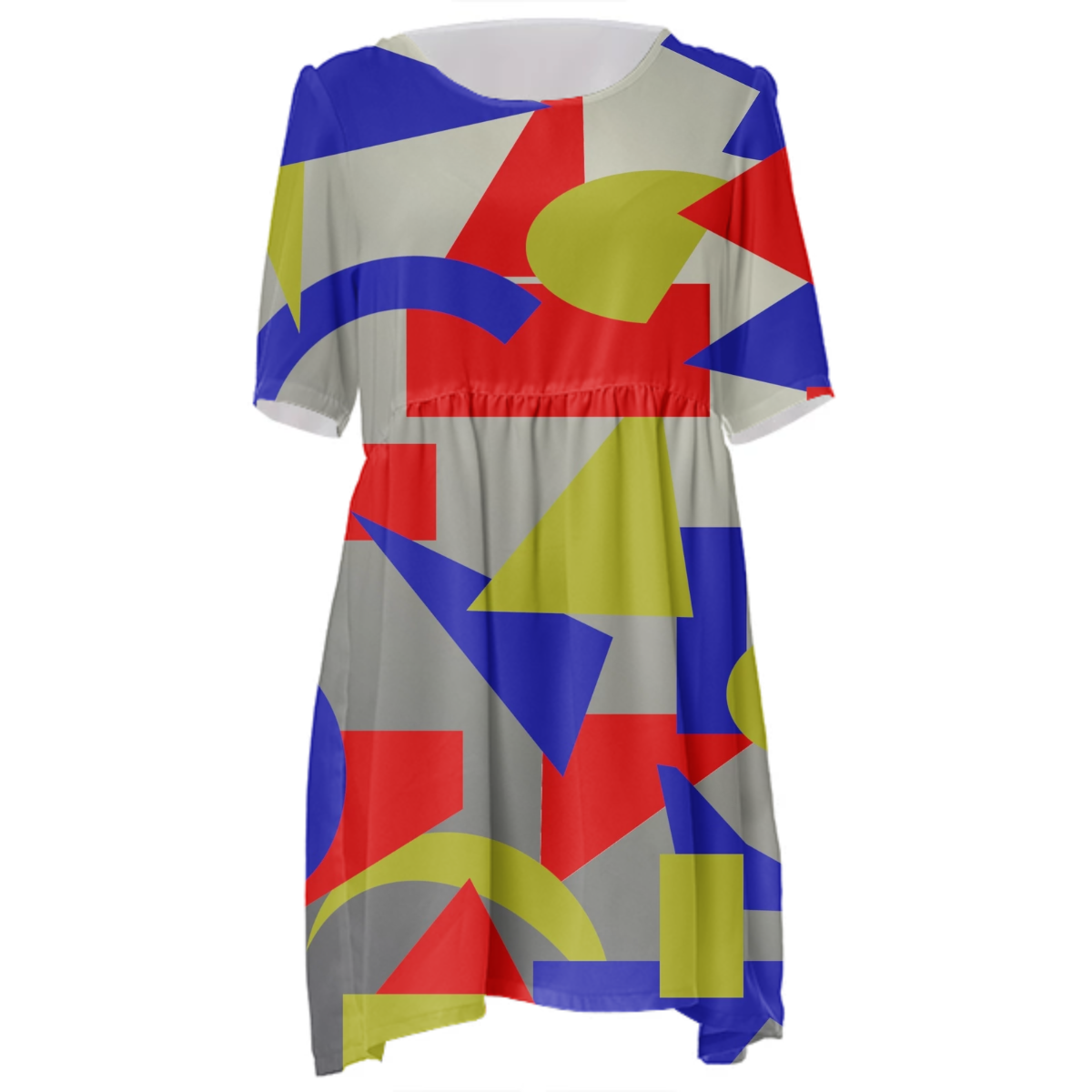 Loose swing fit babydoll dress with shirred waist short sleeves and scoop neckline. The uploaded file will be printed on the entire front and be mirrored on the back. The uploaded file will be printed on the entire front and be mirrored on the back. Because of our cut and sew process some print elements on pockets seams and sleeves might not match up. For best results please upload a PNG or JPG with RGB color profile and dimensions of at least 35 inches width by 40 inches length. DPI can be as low as 72. Since every piece is custom made, it may take 2-4 weeks for delivery. Made in our studio (Shanghai).