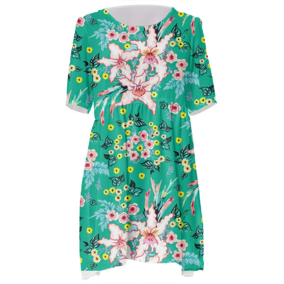 Loose swing fit babydoll dress with shirred waist short sleeves and scoop neckline. The uploaded file will be printed on the entire front and be mirrored on the back. The uploaded file will be printed on the entire front and be mirrored on the back. Because of our cut and sew process some print elements on pockets seams and sleeves might not match up. For best results please upload a PNG or JPG with RGB color profile and dimensions of at least 35 inches width by 40 inches length. DPI can be as low as 72. Since every piece is custom made, it may take 2-4 weeks for delivery. Made in our studio (Shanghai).