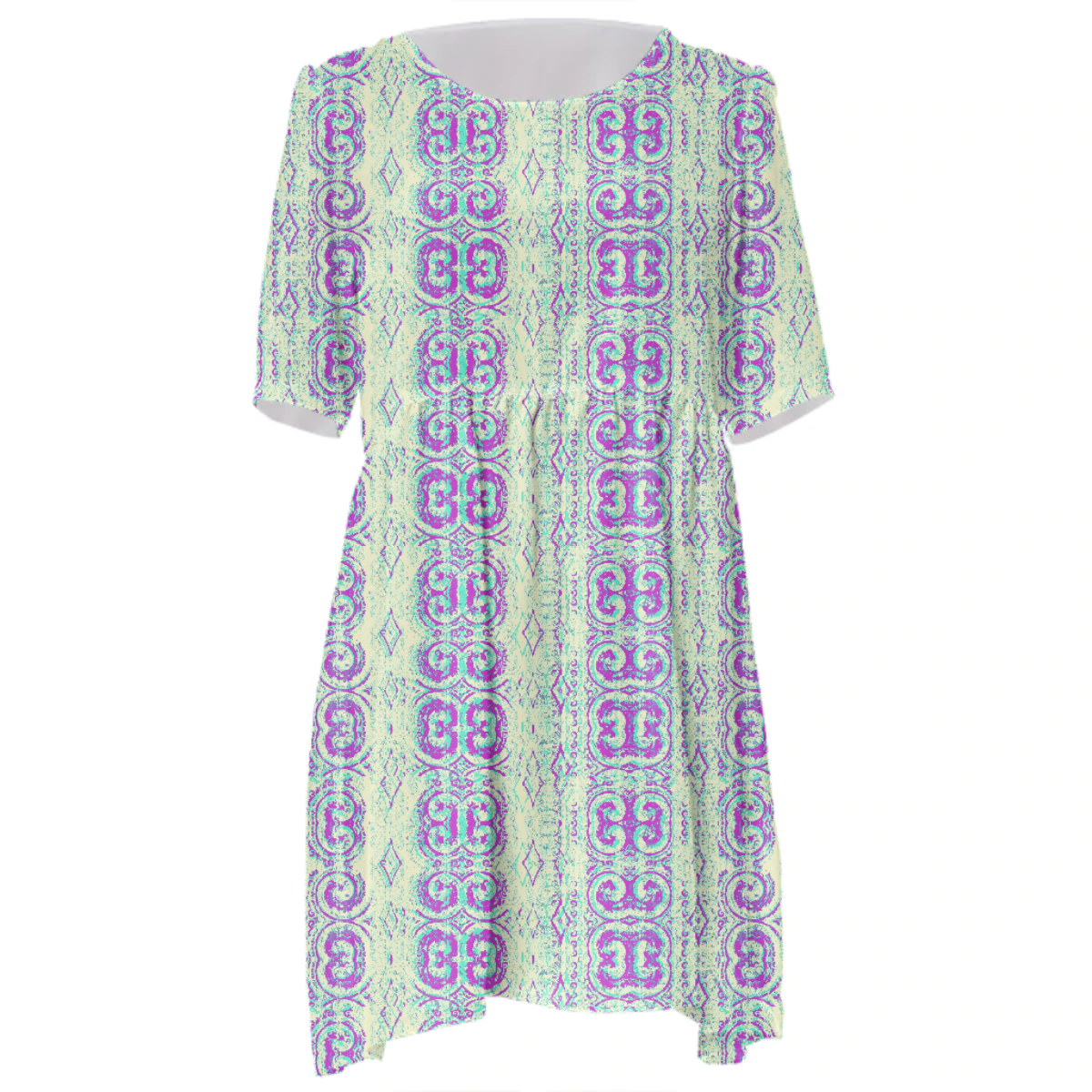 Loose swing fit babydoll dress with shirred waist short sleeves and scoop neckline. The uploaded file will be printed on the entire front and be mirrored on the back. The uploaded file will be printed on the entire front and be mirrored on the back. Because of our cut and sew process some print elements on pockets seams and sleeves might not match up. For best results please upload a PNG or JPG with RGB color profile and dimensions of at least 35 inches width by 40 inches length. DPI can be as low as 72. Since every piece is custom made, it may take 2-4 weeks for delivery. Made in our studio (Shanghai).