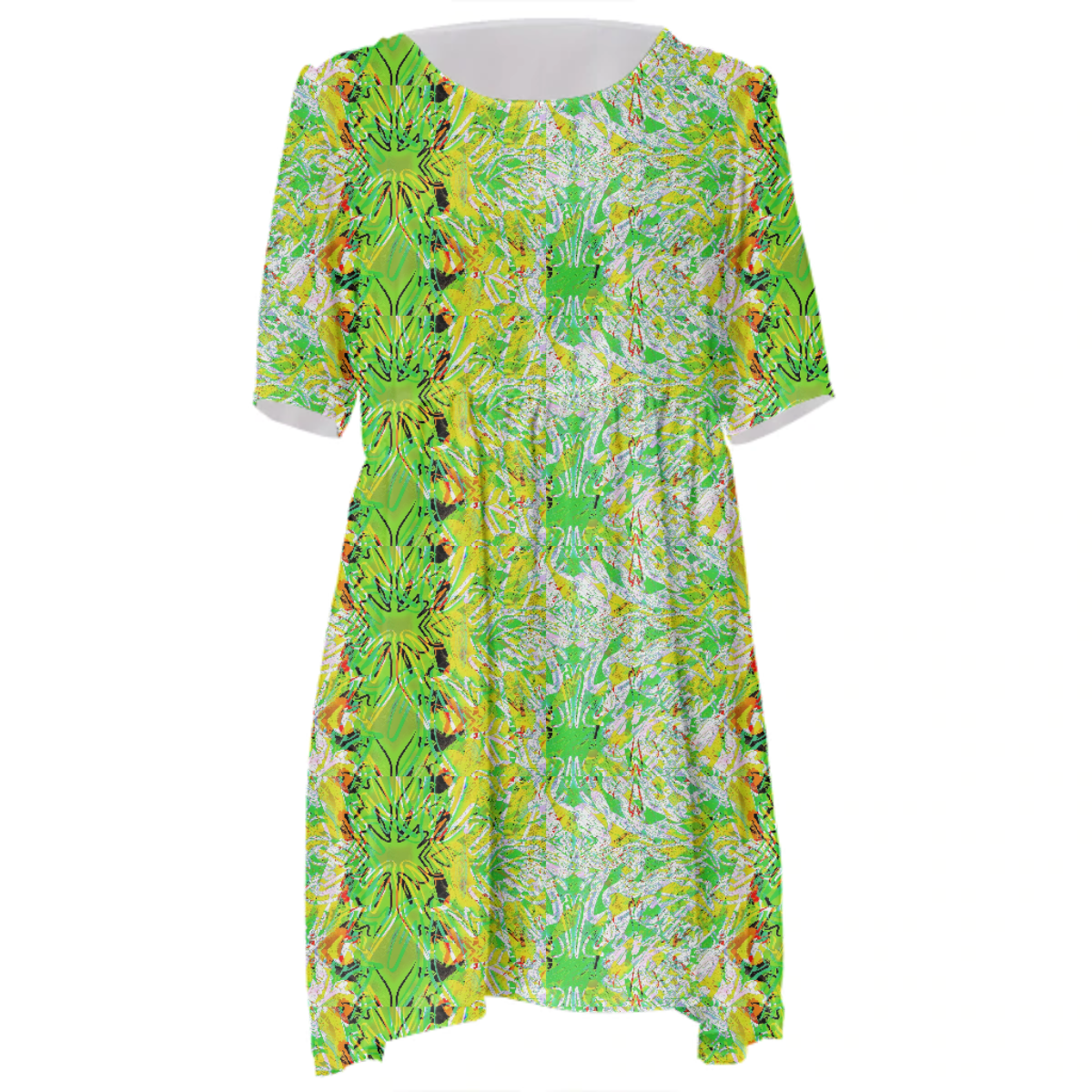 Loose swing fit babydoll dress with shirred waist short sleeves and scoop neckline. The uploaded file will be printed on the entire front and be mirrored on the back. The uploaded file will be printed on the entire front and be mirrored on the back. Because of our cut and sew process some print elements on pockets seams and sleeves might not match up. For best results please upload a PNG or JPG with RGB color profile and dimensions of at least 35 inches width by 40 inches length. DPI can be as low as 72. Since every piece is custom made, it may take 2-4 weeks for delivery. Made in our studio (Shanghai).