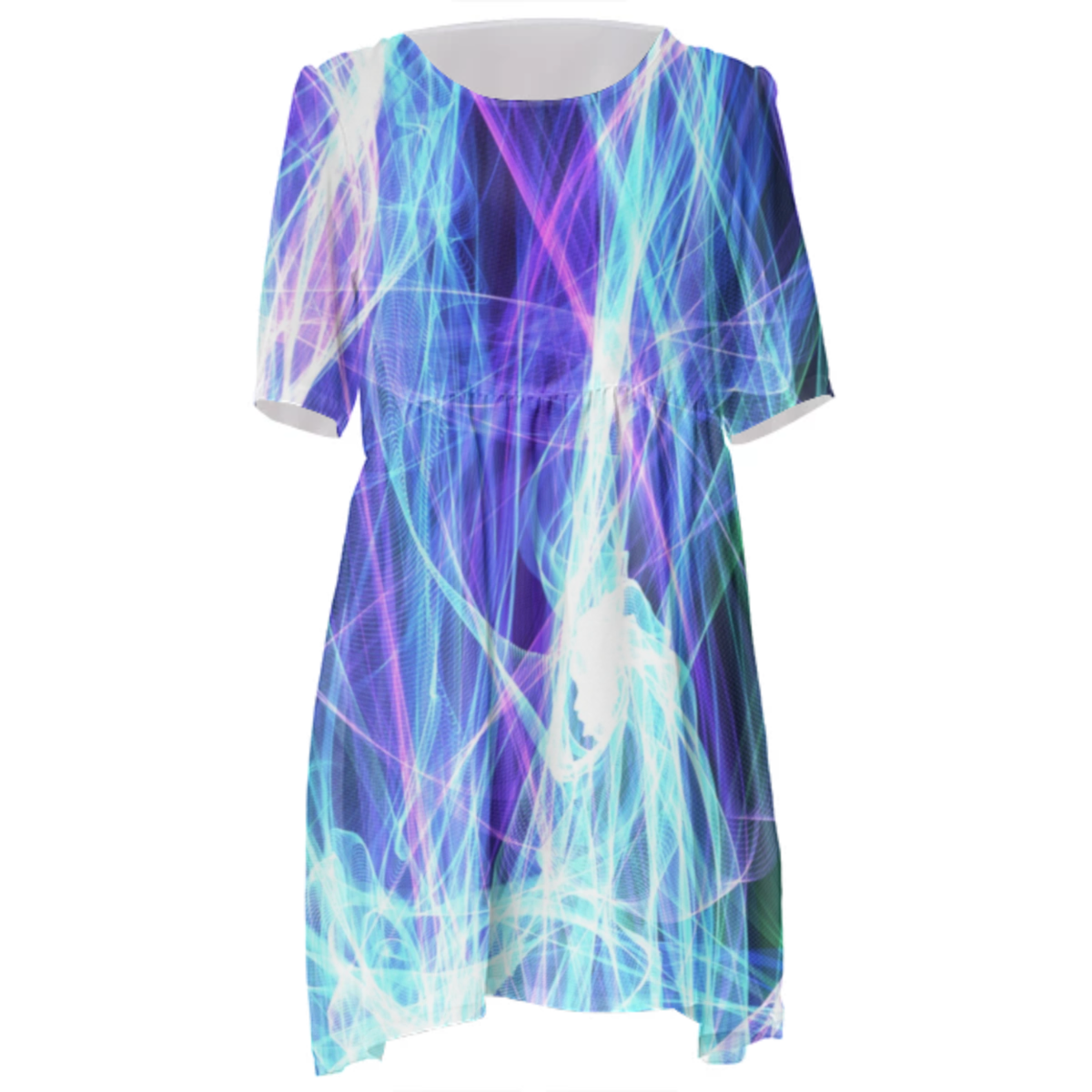 Loose swing fit babydoll dress with shirred waist short sleeves and scoop neckline. The uploaded file will be printed on the entire front and be mirrored on the back. The uploaded file will be printed on the entire front and be mirrored on the back. Because of our cut and sew process some print elements on pockets seams and sleeves might not match up. For best results please upload a PNG or JPG with RGB color profile and dimensions of at least 35 inches width by 40 inches length. DPI can be as low as 72. Since every piece is custom made, it may take 2-4 weeks for delivery. Made in our studio (Shanghai).