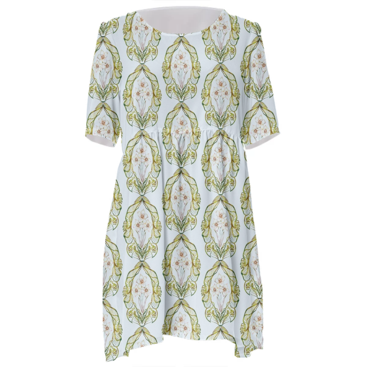 Loose swing fit babydoll dress with shirred waist short sleeves and scoop neckline. The uploaded file will be printed on the entire front and be mirrored on the back. The uploaded file will be printed on the entire front and be mirrored on the back. Because of our cut and sew process some print elements on pockets seams and sleeves might not match up. For best results please upload a PNG or JPG with RGB color profile and dimensions of at least 35 inches width by 40 inches length. DPI can be as low as 72. Since every piece is custom made, it may take 2-4 weeks for delivery. Made in our studio (Shanghai).