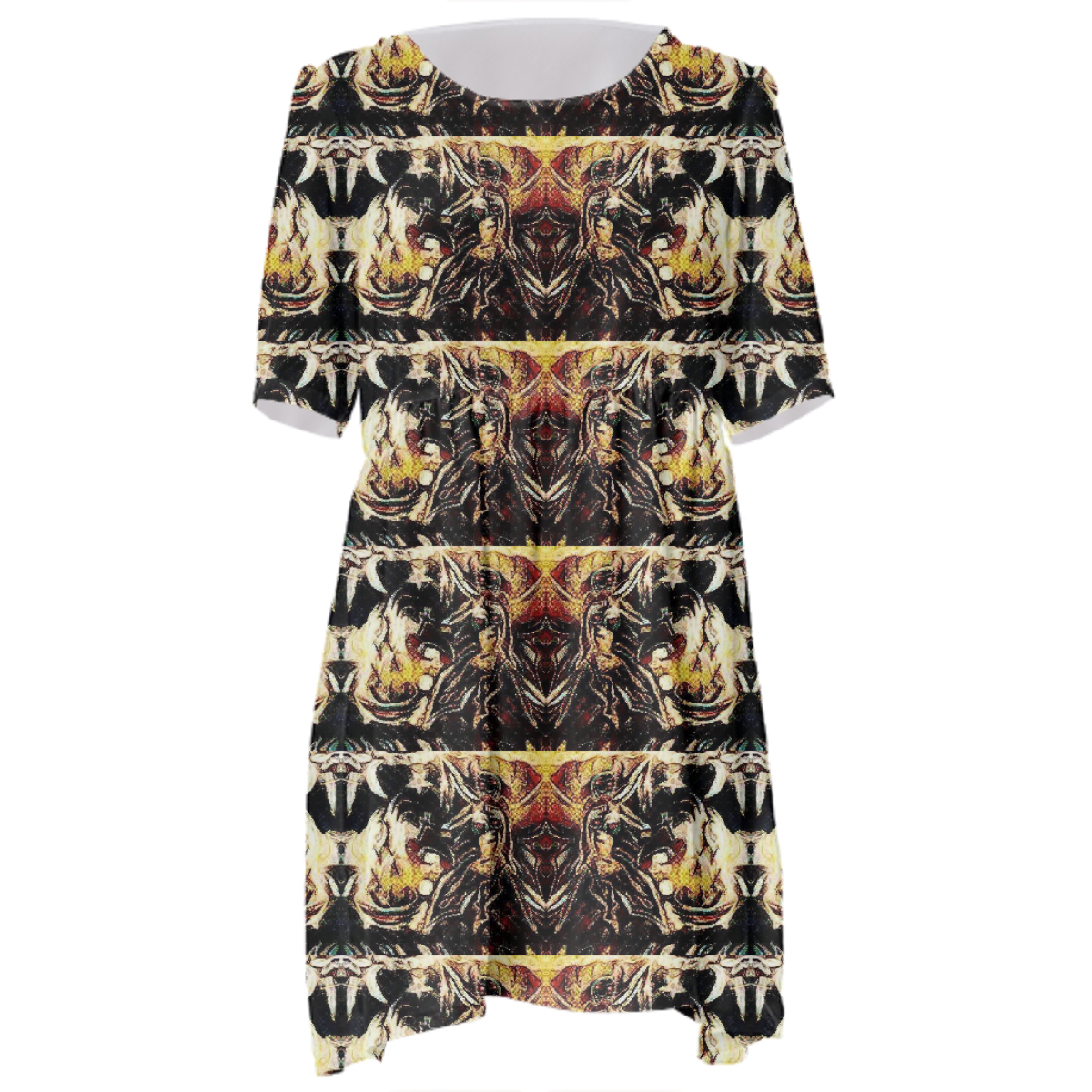 Loose swing fit babydoll dress with shirred waist short sleeves and scoop neckline. The uploaded file will be printed on the entire front and be mirrored on the back. The uploaded file will be printed on the entire front and be mirrored on the back. Because of our cut and sew process some print elements on pockets seams and sleeves might not match up. For best results please upload a PNG or JPG with RGB color profile and dimensions of at least 35 inches width by 40 inches length. DPI can be as low as 72. Since every piece is custom made, it may take 2-4 weeks for delivery. Made in our studio (Shanghai).