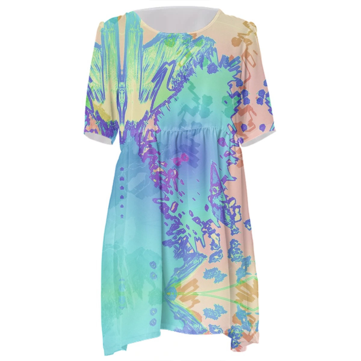 Loose swing fit babydoll dress with shirred waist short sleeves and scoop neckline. The uploaded file will be printed on the entire front and be mirrored on the back. The uploaded file will be printed on the entire front and be mirrored on the back. Because of our cut and sew process some print elements on pockets seams and sleeves might not match up. For best results please upload a PNG or JPG with RGB color profile and dimensions of at least 35 inches width by 40 inches length. DPI can be as low as 72. Since every piece is custom made, it may take 2-4 weeks for delivery. Made in our studio (Shanghai).