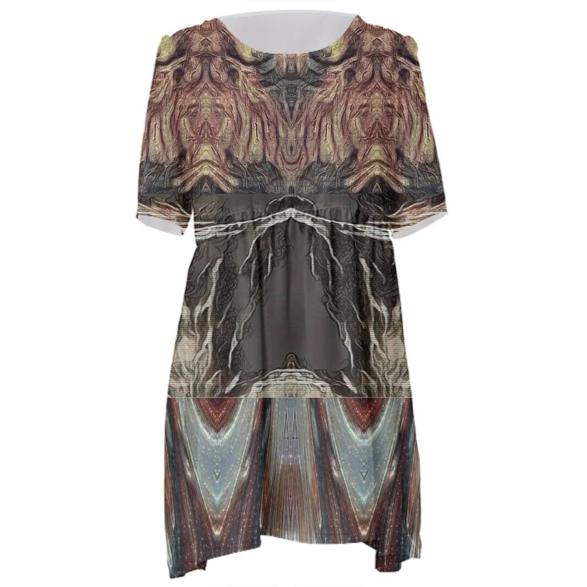 Loose swing fit babydoll dress with shirred waist short sleeves and scoop neckline. The uploaded file will be printed on the entire front and be mirrored on the back. The uploaded file will be printed on the entire front and be mirrored on the back. Because of our cut and sew process some print elements on pockets seams and sleeves might not match up. For best results please upload a PNG or JPG with RGB color profile and dimensions of at least 35 inches width by 40 inches length. DPI can be as low as 72. Since every piece is custom made, it may take 2-4 weeks for delivery. Made in our studio (Shanghai).