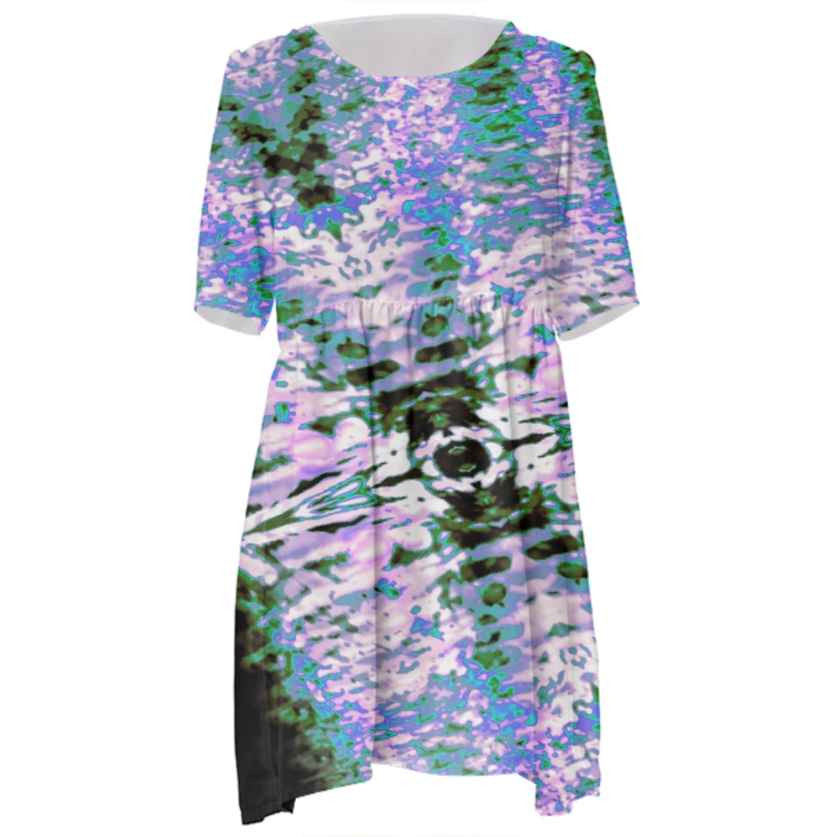 Loose swing fit babydoll dress with shirred waist short sleeves and scoop neckline. The uploaded file will be printed on the entire front and be mirrored on the back. The uploaded file will be printed on the entire front and be mirrored on the back. Because of our cut and sew process some print elements on pockets seams and sleeves might not match up. For best results please upload a PNG or JPG with RGB color profile and dimensions of at least 35 inches width by 40 inches length. DPI can be as low as 72. Since every piece is custom made, it may take 2-4 weeks for delivery. Made in our studio (Shanghai).