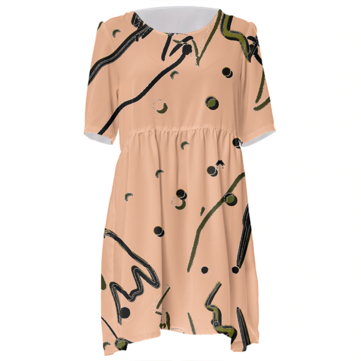 Loose swing fit babydoll dress with shirred waist short sleeves and scoop neckline. The uploaded file will be printed on the entire front and be mirrored on the back. The uploaded file will be printed on the entire front and be mirrored on the back. Because of our cut and sew process some print elements on pockets seams and sleeves might not match up. For best results please upload a PNG or JPG with RGB color profile and dimensions of at least 35 inches width by 40 inches length. DPI can be as low as 72. Since every piece is custom made, it may take 2-4 weeks for delivery. Made in our studio (Shanghai).