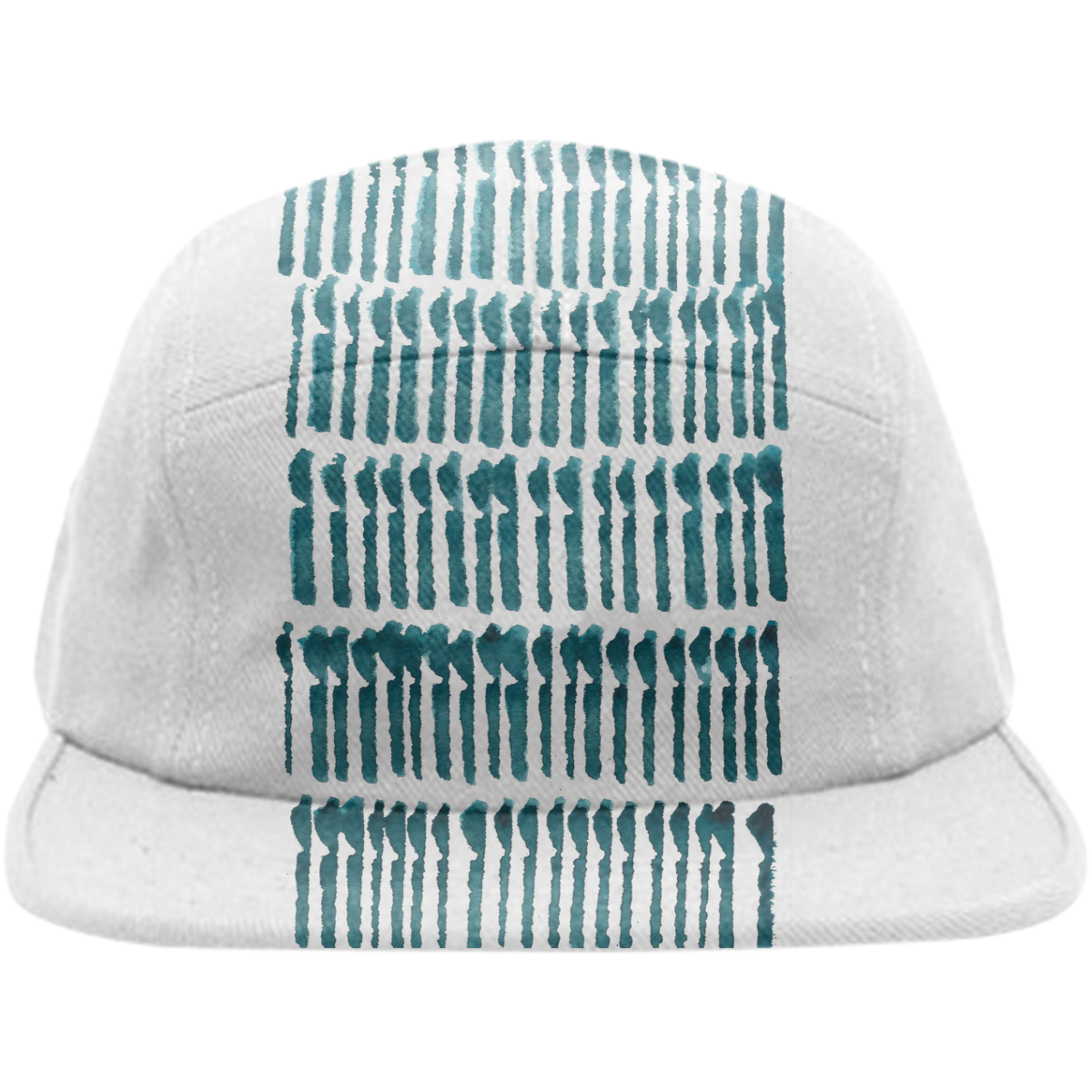 Five panel baseball hat with adjustable nylon strap for sizing.