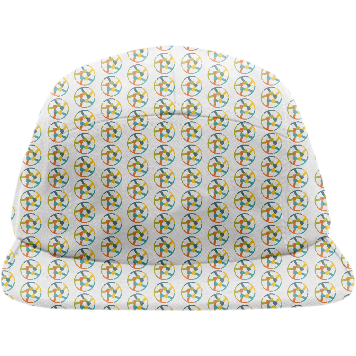 Five panel baseball hat with adjustable nylon strap for sizing.