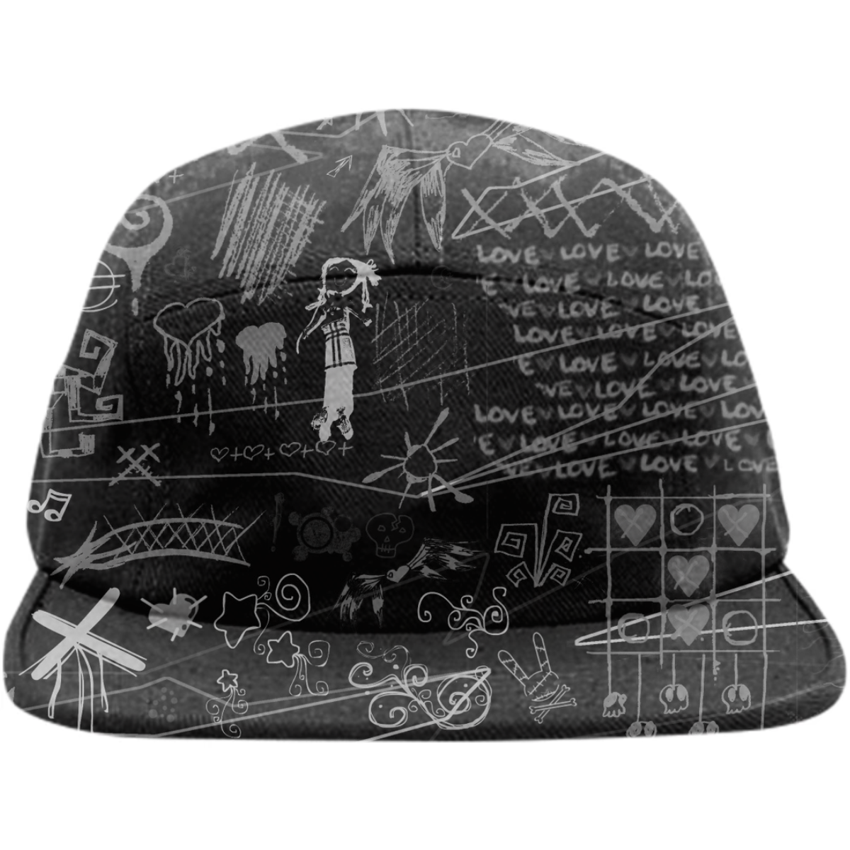 Five panel baseball hat with adjustable nylon strap for sizing.