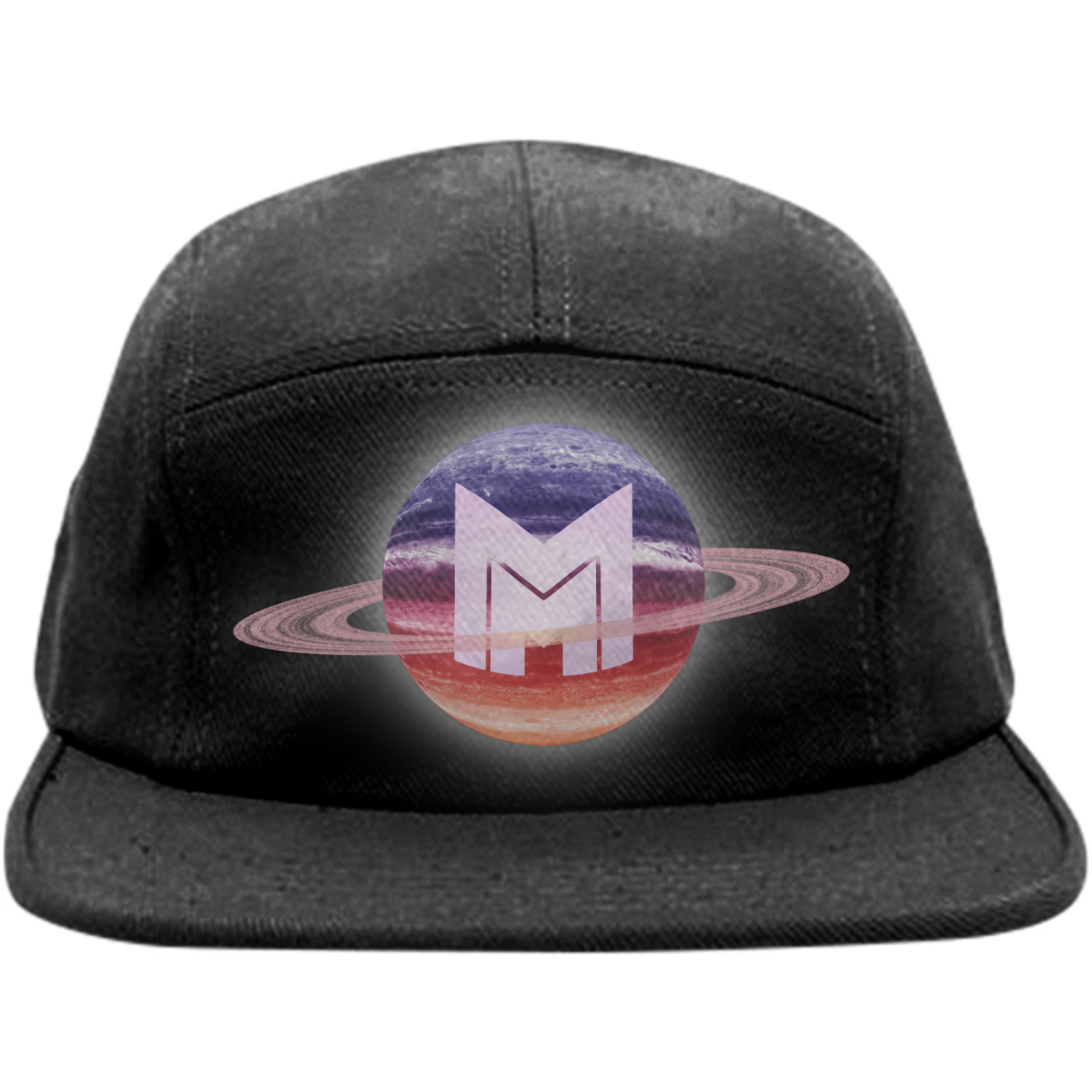 Five panel baseball hat with adjustable nylon strap for sizing.