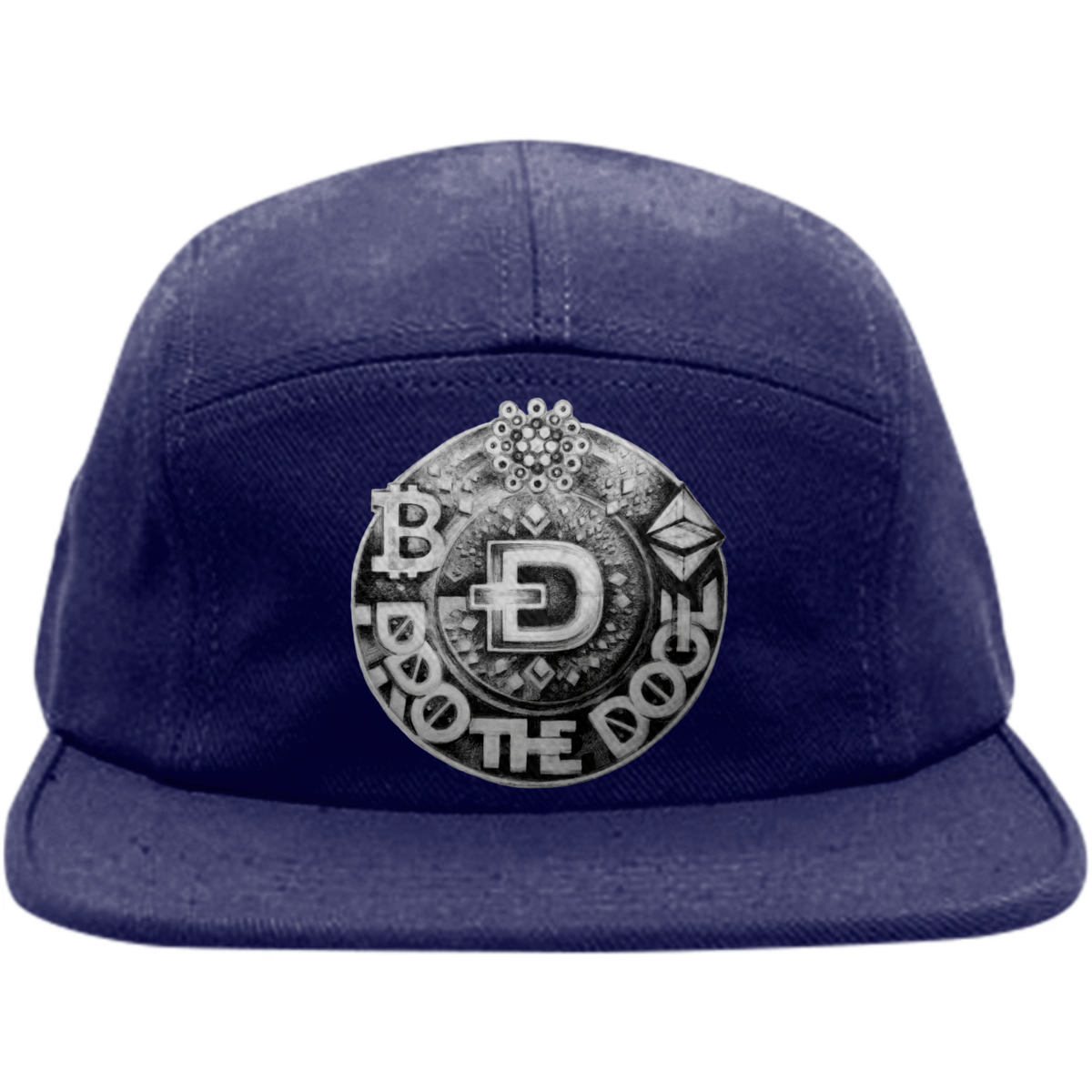 Five panel baseball hat with adjustable nylon strap for sizing.