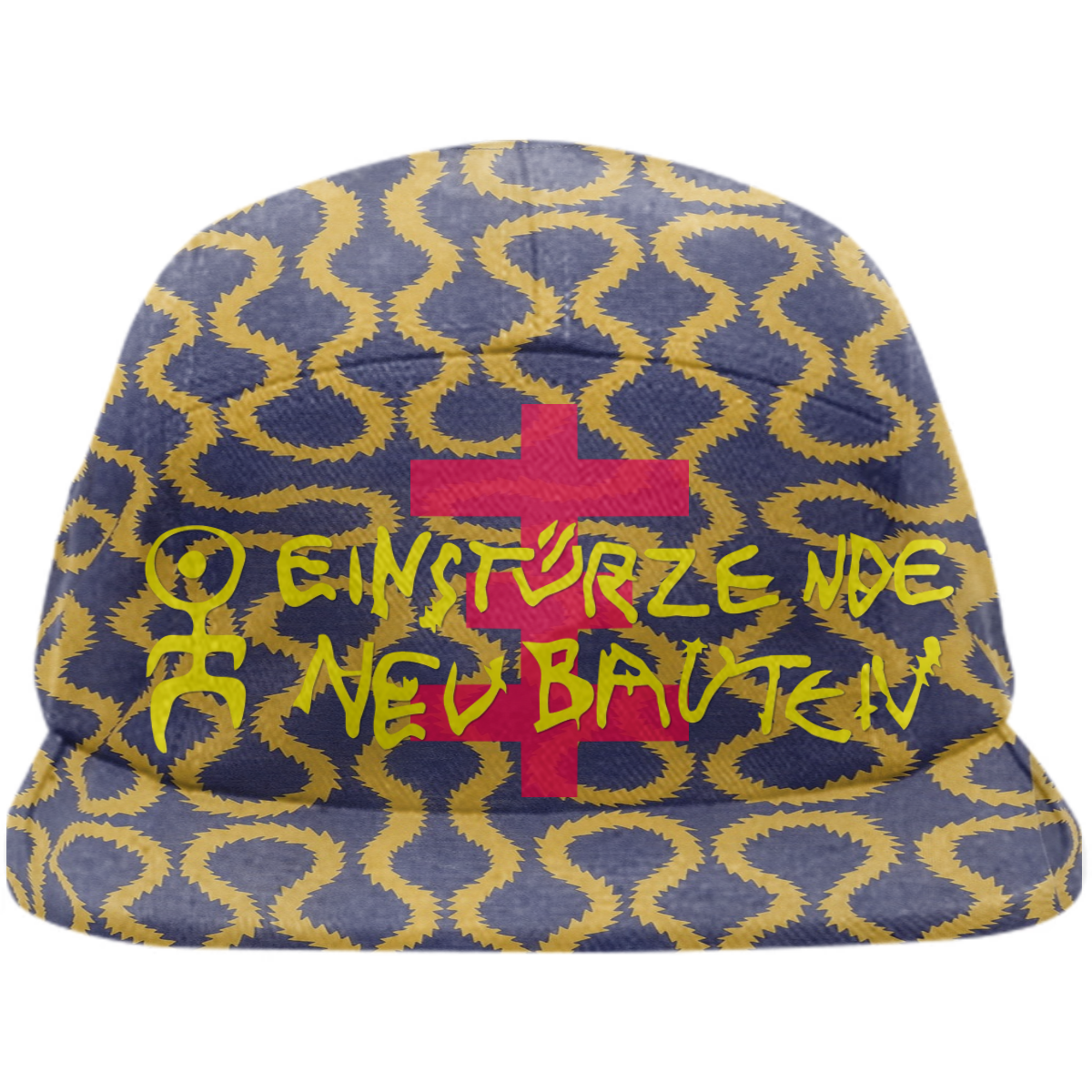 Five panel baseball hat with adjustable nylon strap for sizing.