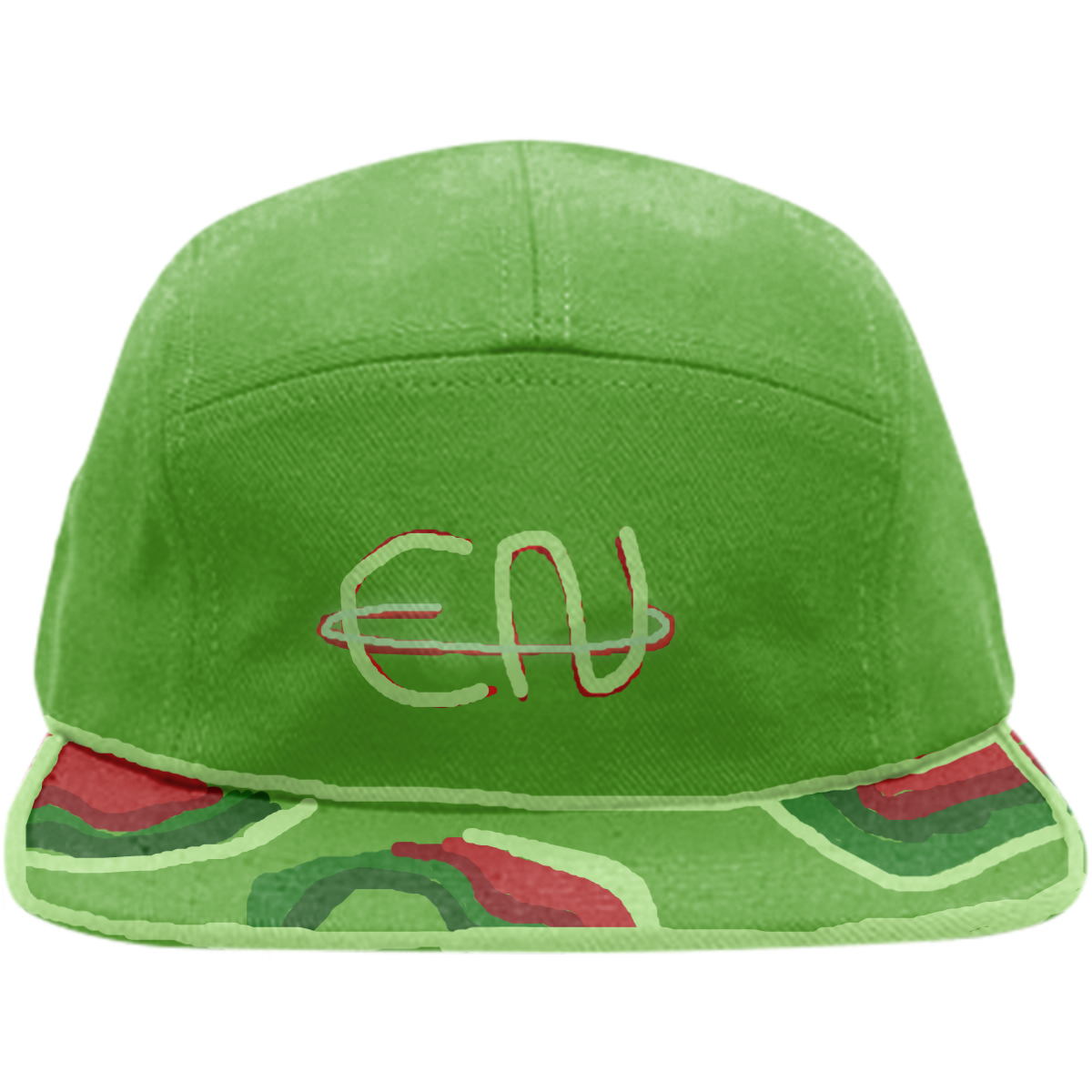 Five panel baseball hat with adjustable nylon strap for sizing.
