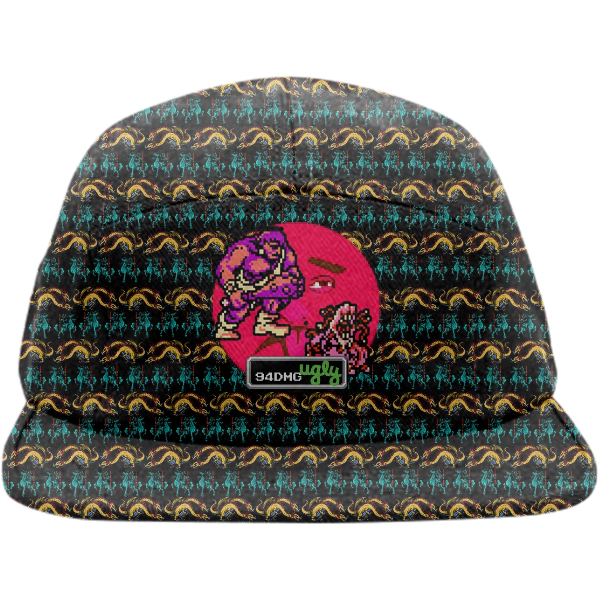 Five panel baseball hat with adjustable nylon strap for sizing.