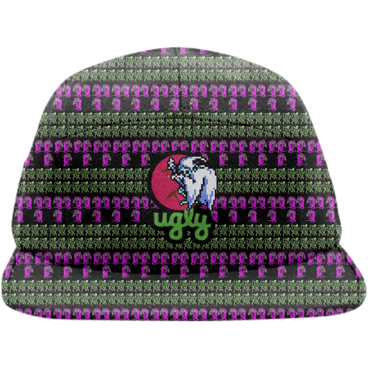Five panel baseball hat with adjustable nylon strap for sizing.