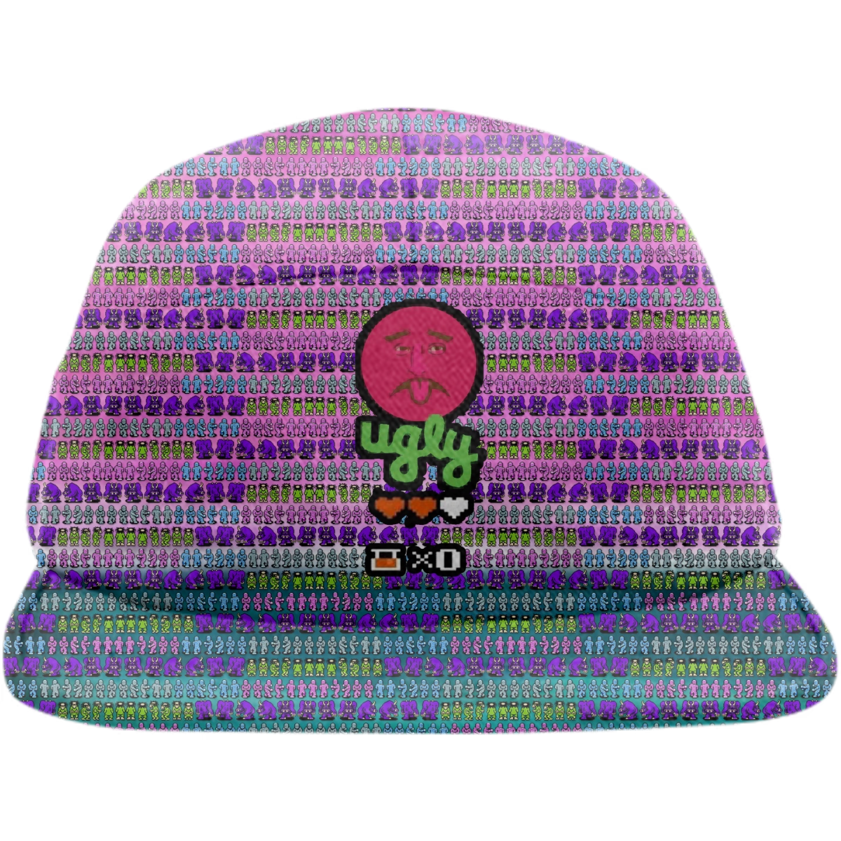 Five panel baseball hat with adjustable nylon strap for sizing.