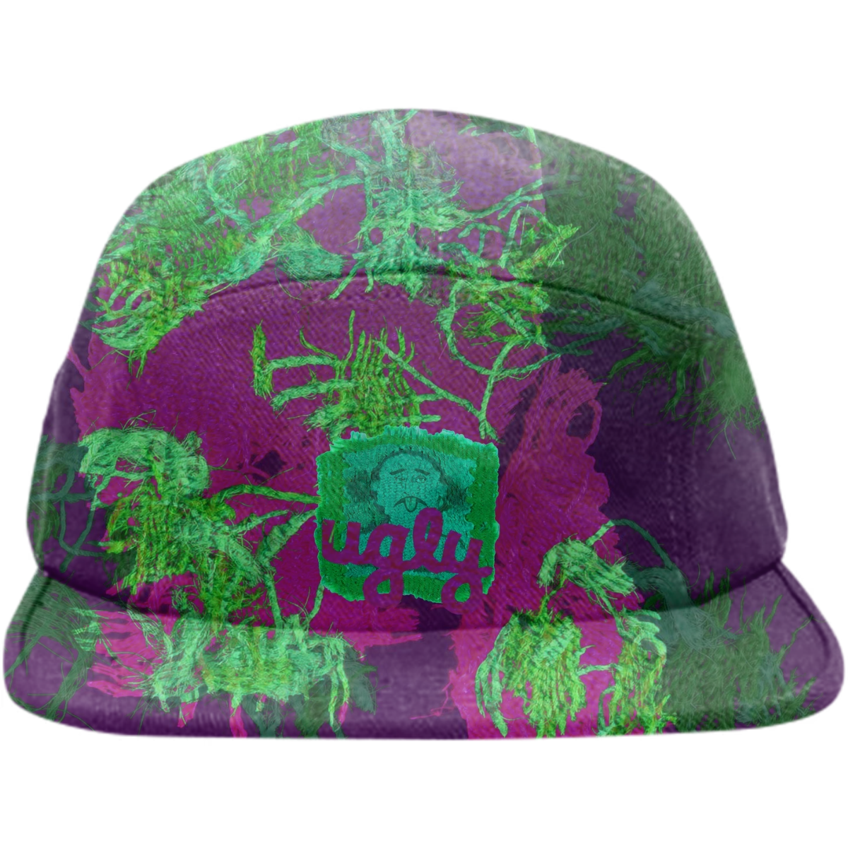 Five panel baseball hat with adjustable nylon strap for sizing.