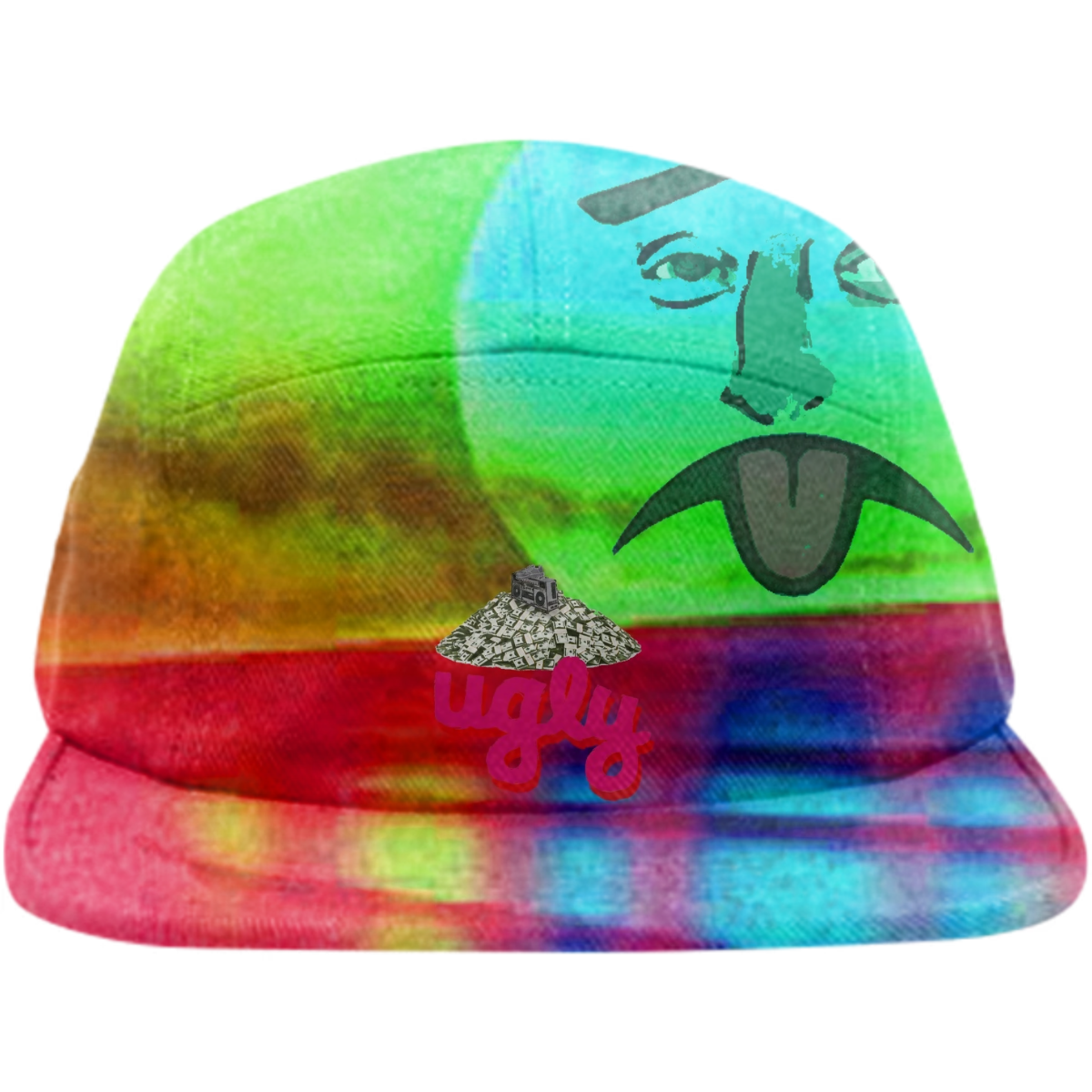 Five panel baseball hat with adjustable nylon strap for sizing.