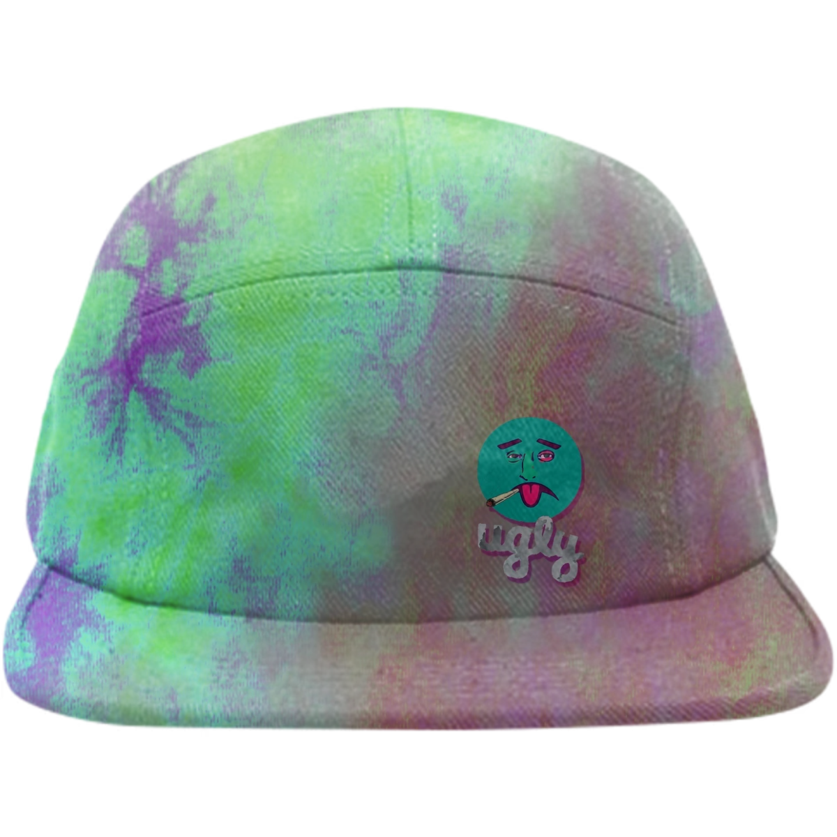 Five panel baseball hat with adjustable nylon strap for sizing.