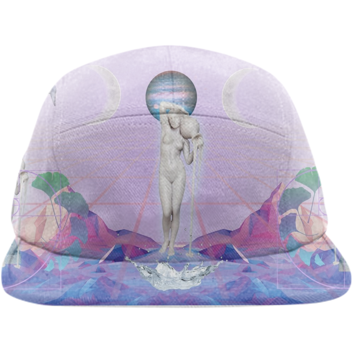 Five panel baseball hat with adjustable nylon strap for sizing.