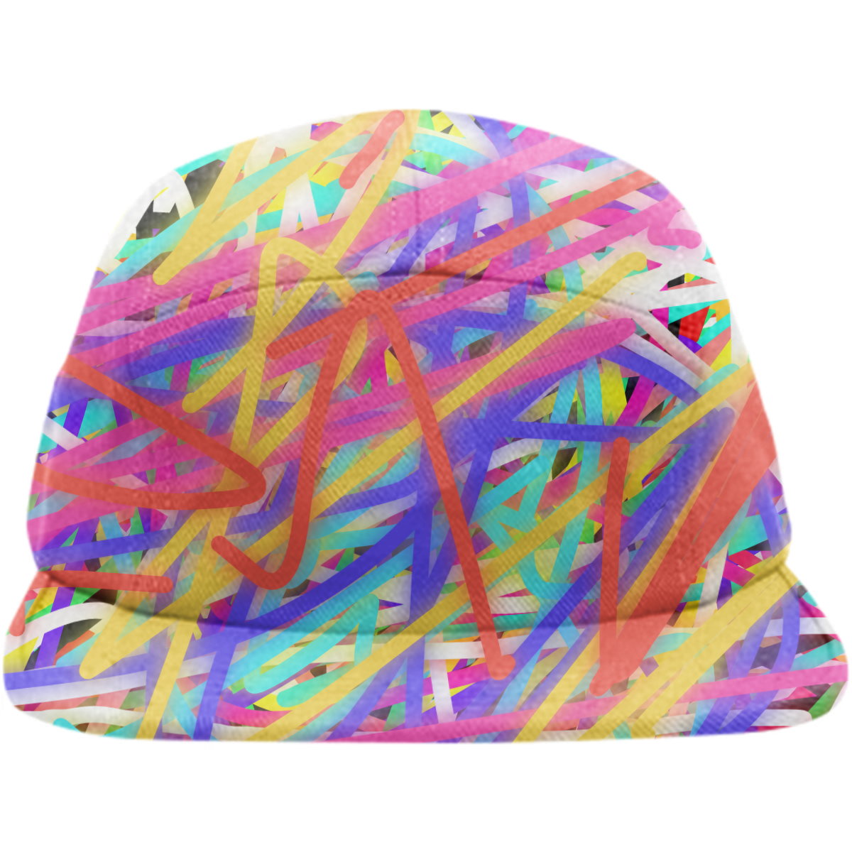 Five panel baseball hat with adjustable nylon strap for sizing.
