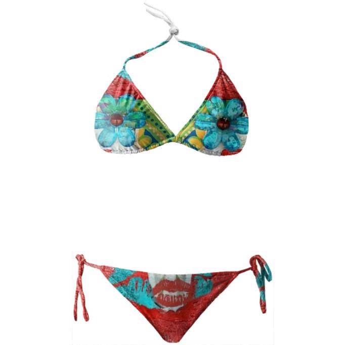 String bikini with ties at the neck bust and hips. Throw it in a bag and head to the beach!
