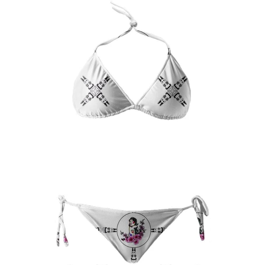 String bikini with ties at the neck bust and hips. Throw it in a bag and head to the beach!