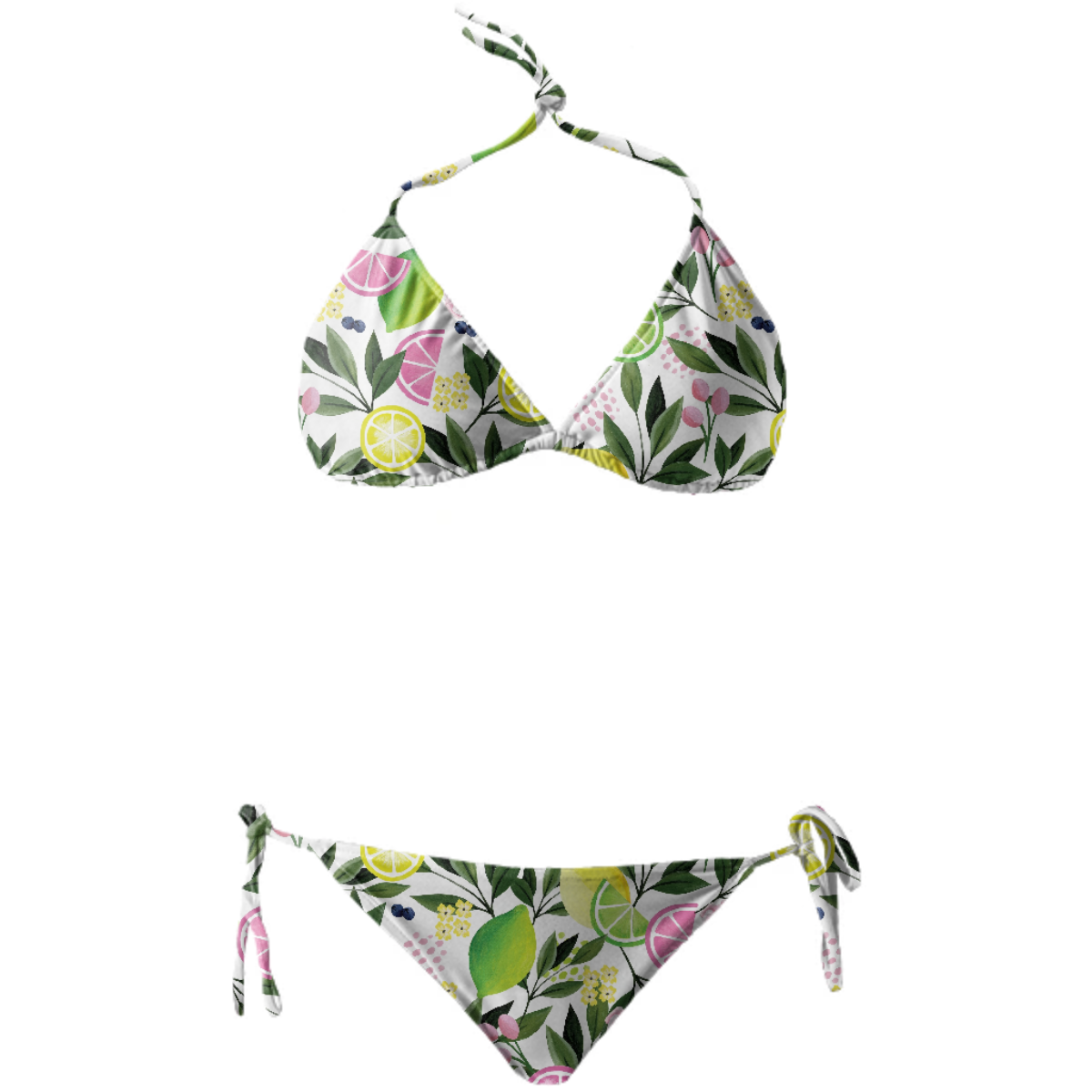String bikini with ties at the neck bust and hips. Throw it in a bag and head to the beach!