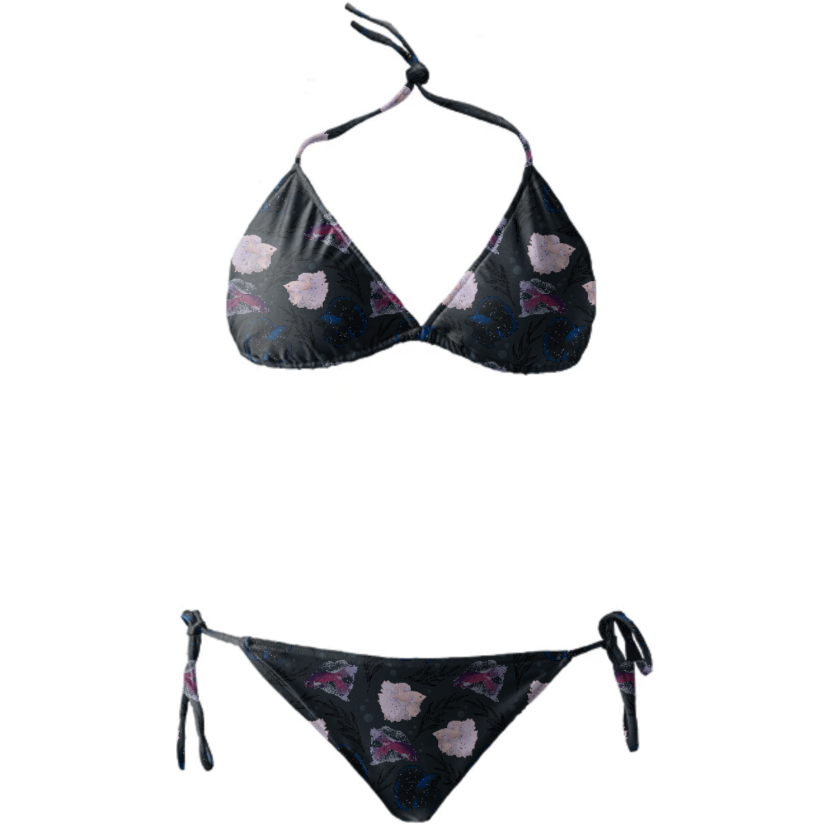 String bikini with ties at the neck bust and hips. Throw it in a bag and head to the beach!